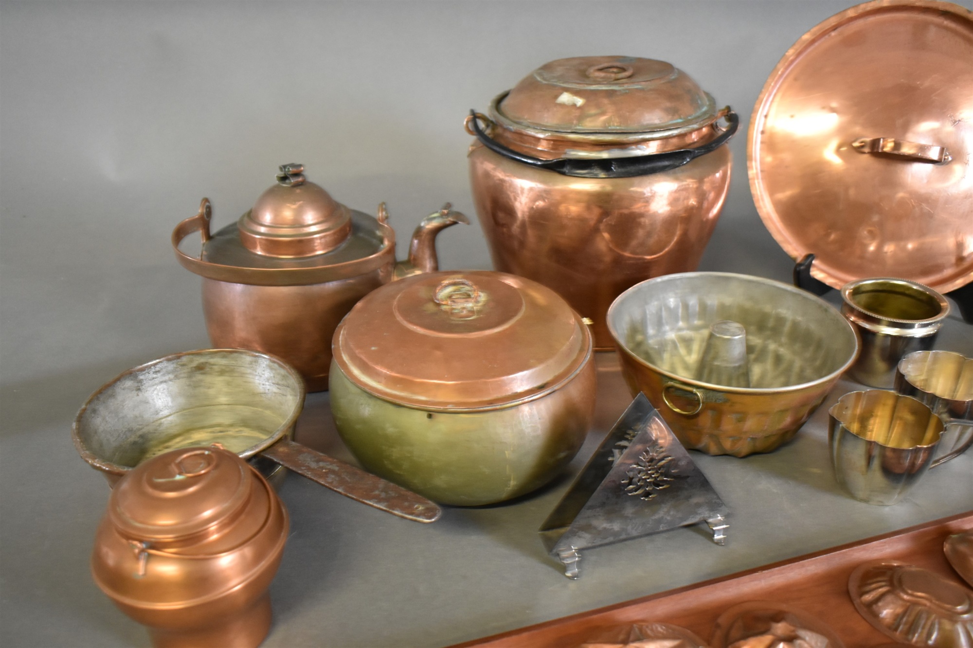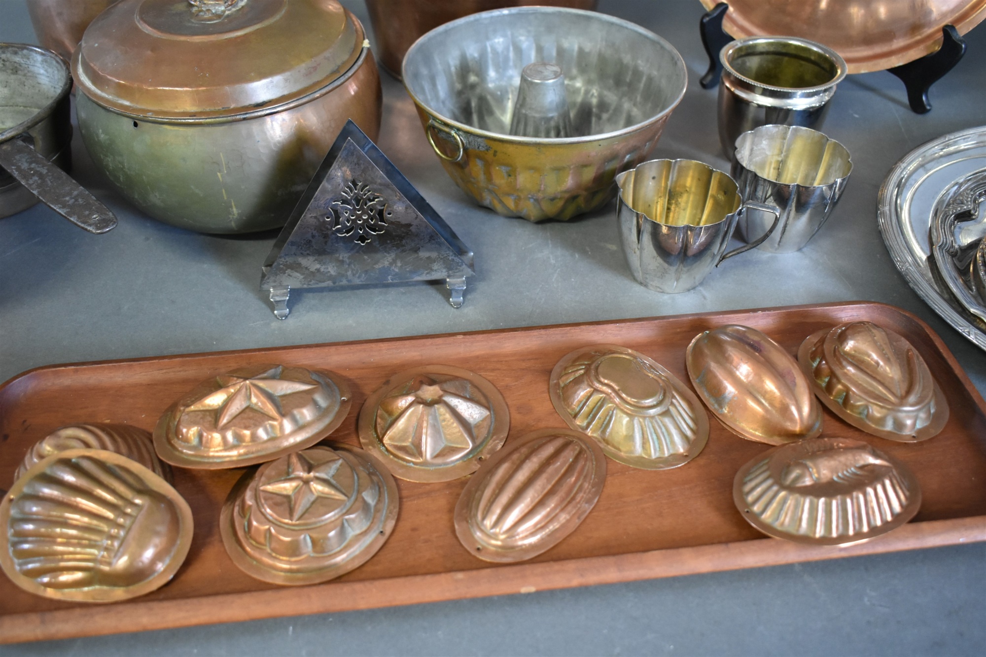 Parti koppar och metall bla formar, kaffepumpa och hunk med lock, högsta höjd på bild 32 cm