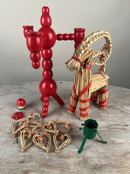 mini julgransfot + halmpynt + 2 äldre ljusstakar i trä