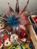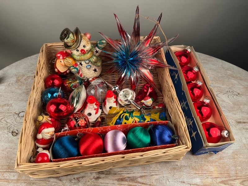 äldre pynt bl.a glaskulor+fönsterklistermärken+stjärna+korg