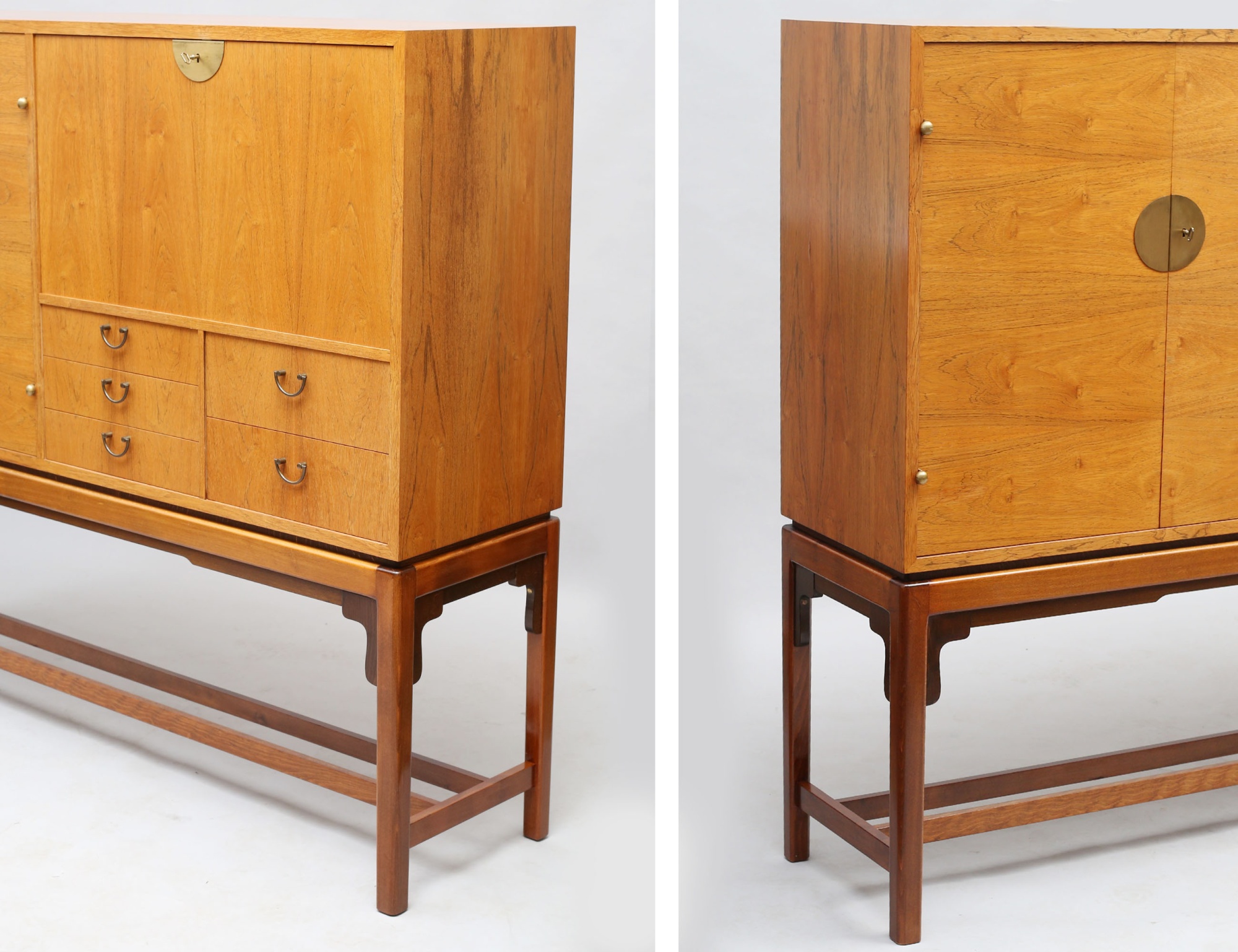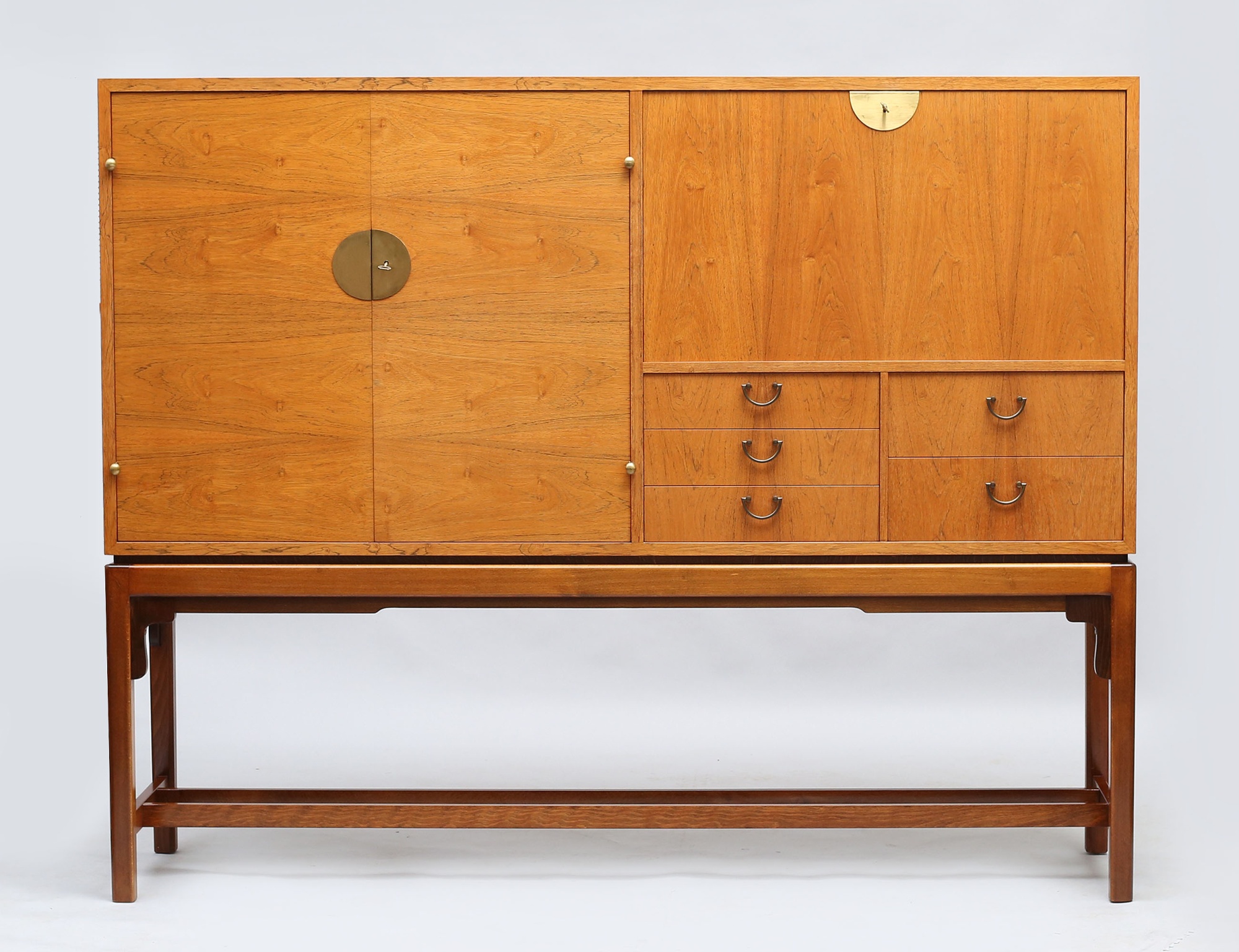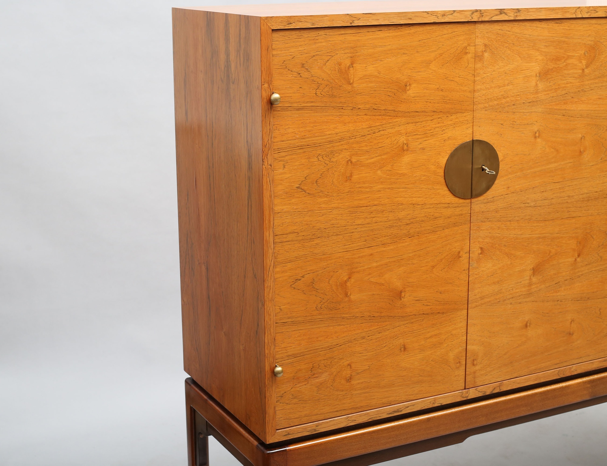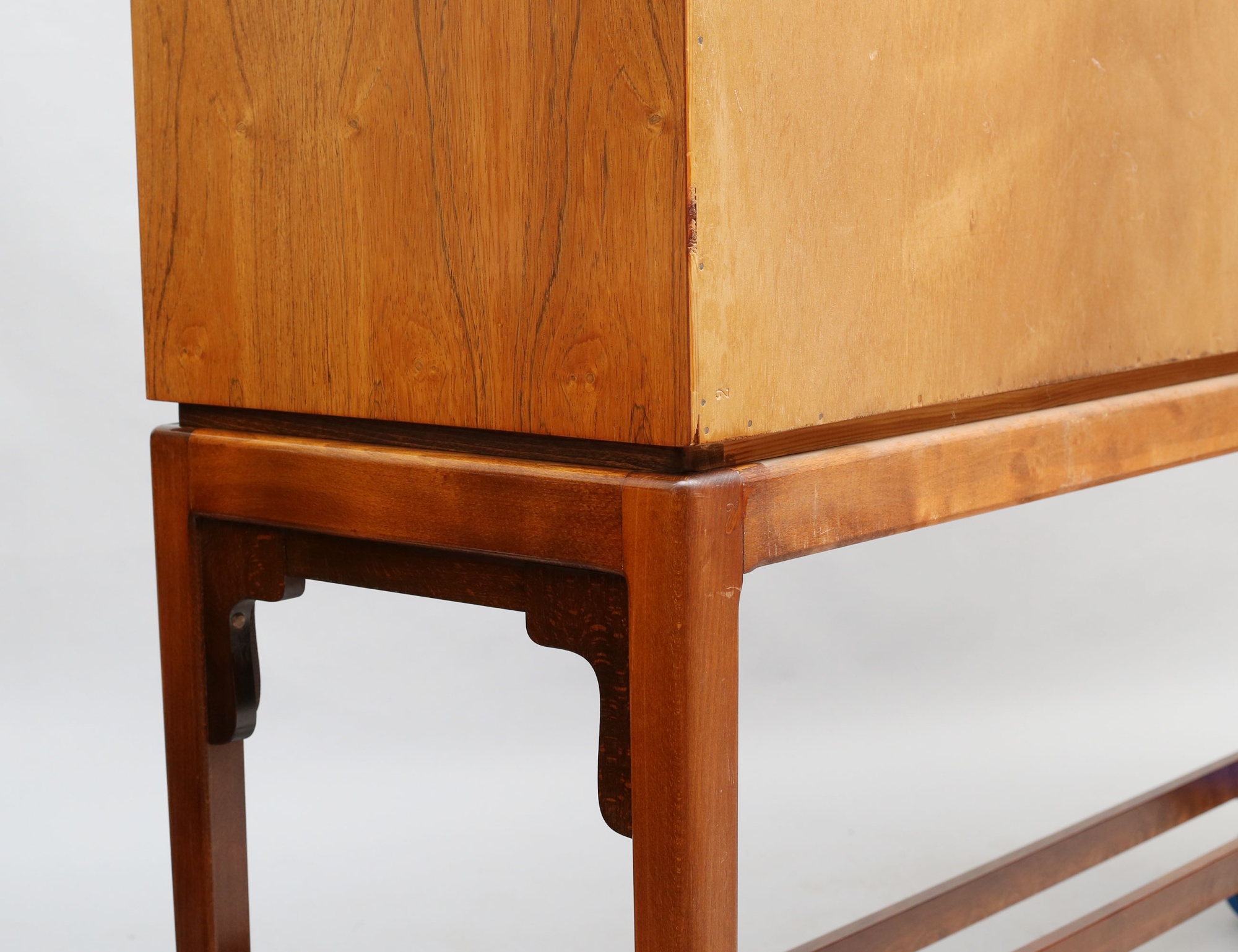oidentifierad formgivare, på benställning, jakaranda, fronten med två skåp varav ett med klaff, fem lådor, beslag och handtag av mässing, höjd 140, bredd 175, djup 43, citesintyg medföljer (obetydligt bruksslitage)