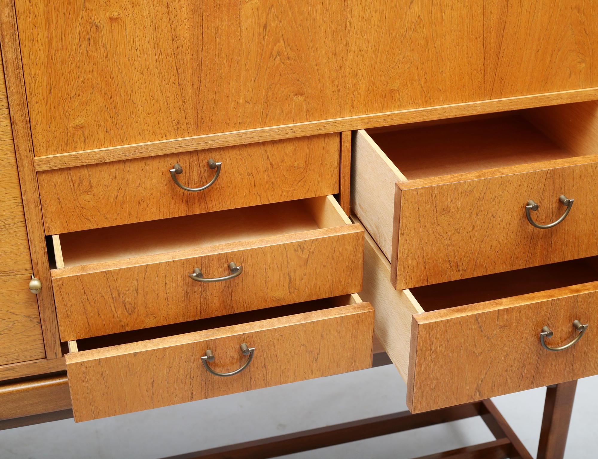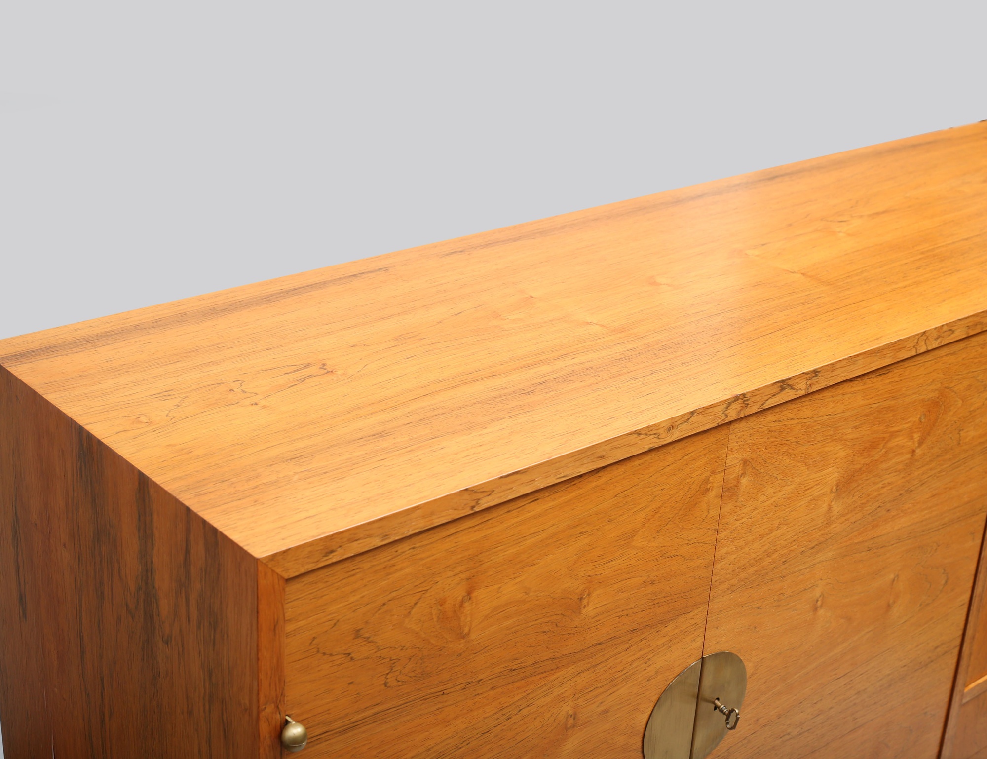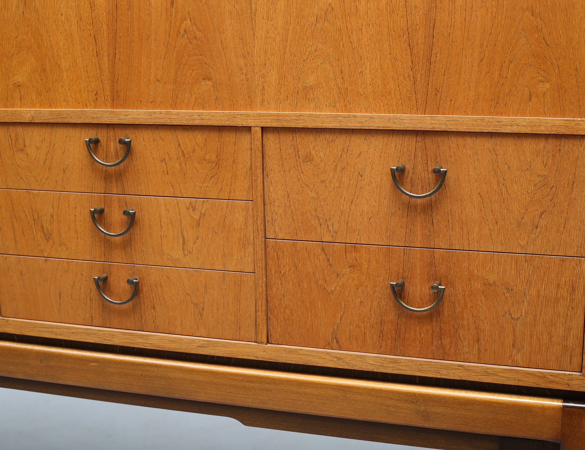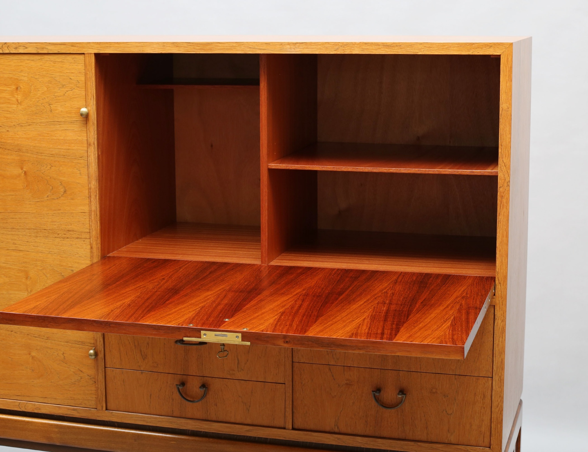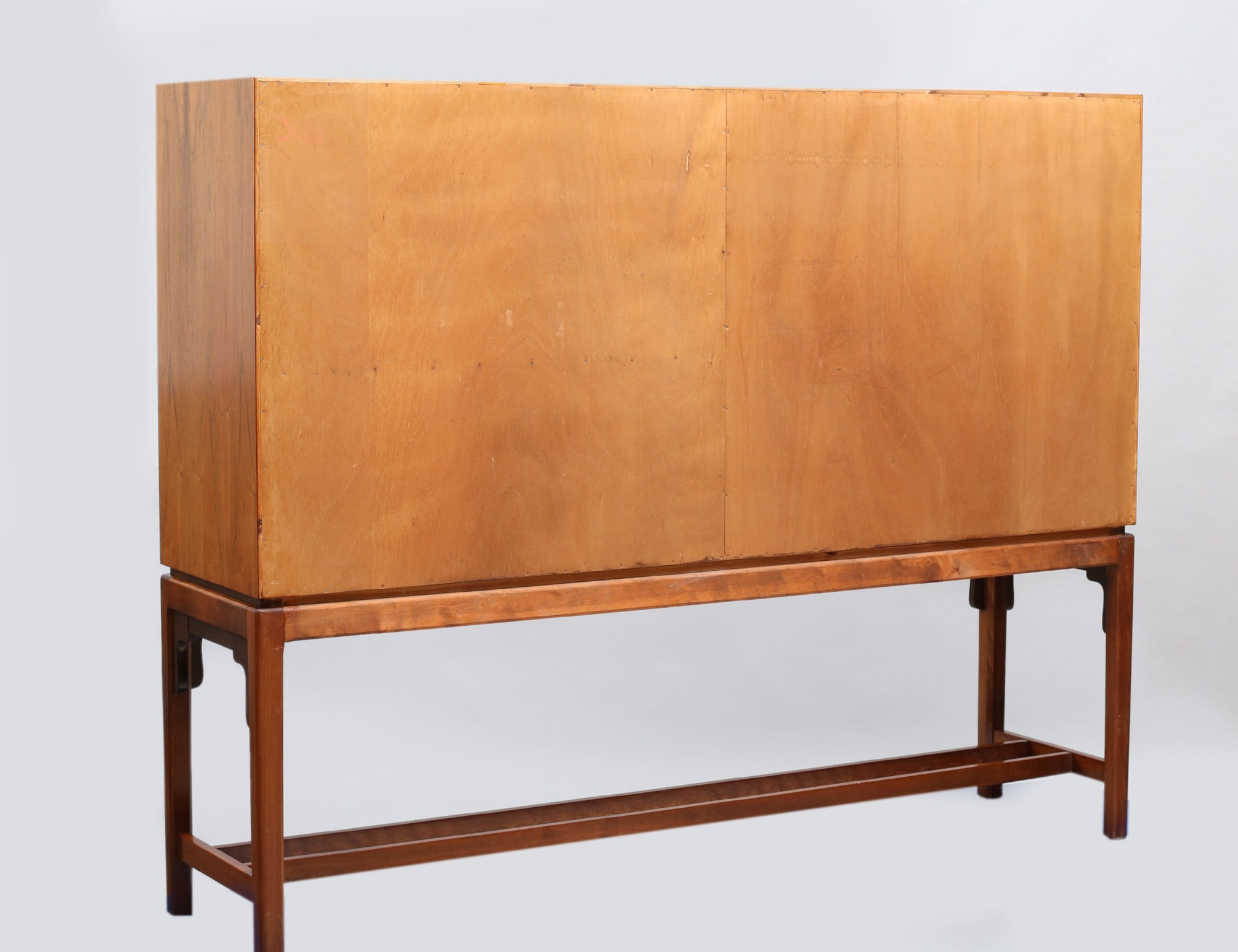 oidentifierad formgivare, på benställning, jakaranda, fronten med två skåp varav ett med klaff, fem lådor, beslag och handtag av mässing, höjd 140, bredd 175, djup 43, citesintyg medföljer (obetydligt bruksslitage)