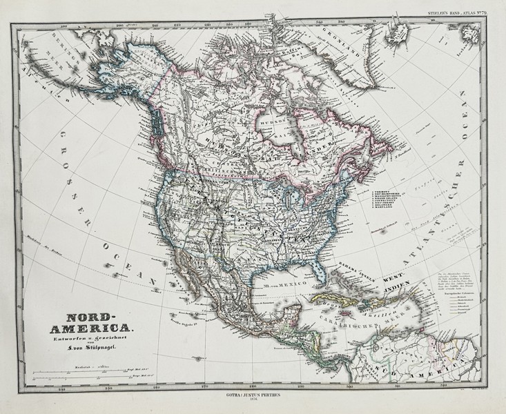 This copperplate engraving is a highly detailed geographical map of North America, encompassing the entire continent from Greenland and the Canadian Arctic south through Central America and the West Indies. The map illustrates the political boundaries of the United States, Mexico, and British North America, using hand-coloring to delineate the major administrative and political areas. The map reflects the state of cartographic knowledge in the mid-19th century, showing extensive detail along the eastern coastlines and emerging, often speculative geography in the unexplored central and western territories. The map was published in Stieler's Hand-Atlas.