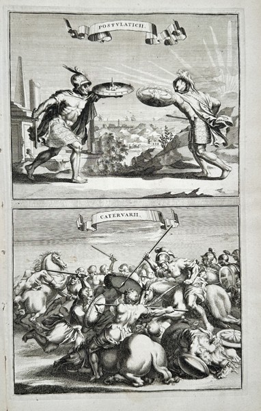 This engraving features two scenes related to ancient military practices and ritualized combat. The upper panel depicts two armored figures engaged in a ceremonial or symbolic duel, potentially reflecting a custom known as Postulatich. The lower panel illustrates a dense, chaotic battle involving both infantry and cavalry, characteristic of a skirmish or an engagement by irregular forces known as Catervarii. The print is a visual reconstruction drawn from historical accounts, used to illustrate military tactics and customs in an early eighteenth century antiquarian text.
