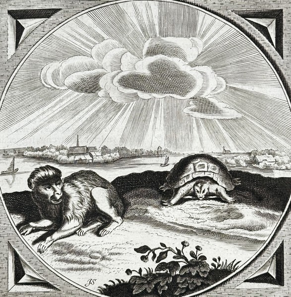This emblem illustrates the concept of discord arising from imbalance or inequality, conveyed by the Latin motto "That Which is Unequal is in Discord." The central engraving shows two opposing animals, possibly lions or wolves, resting on a small hill under a beam of divine light breaking through the clouds. The image and the accompanying Dutch and Latin verses offer a moral commentary on the necessity of symmetry or proper matching in nature and relationships to ensure harmony. This print originates from a popular seventeenth century emblem book designed for ethical instruction.