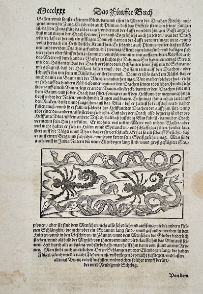 This detailed woodcut, used as a frieze-like illustration, depicts two large, stylized scorpions or venomous serpents engaged in combat, intertwined with foliage. The image accompanies German text concerning the appearance and habits of various exotic creatures, including the legendary dragon, found in India and other remote regions. The print is characteristic of sixteenth century natural history illustration, which documented both real and mythological creatures for educational purposes.