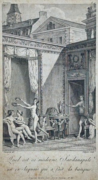 This satirical print portrays an interior scene of ostentatious wealth and decadence, critiquing the rapidly acquired fortunes of the Restoration period in France. The central composition features several scantily-clad women presenting tokens of luxury within a highly ornate room furnished with classical elements and heavy draperies. The accompanying caption directly refers to the legendary Assyrian king Sardanapalus, suggesting that the scene depicts the lavish lifestyle of a newly wealthy figure, potentially an opportunist of humble origins.