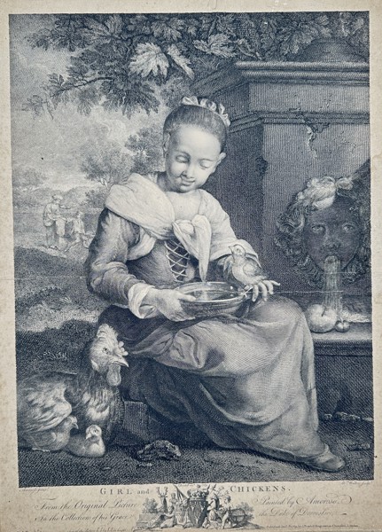 Bilder Antonio Mercurio Amorosi (1660–1738), after – Girl and Chickens – Engraving (c. 1775)