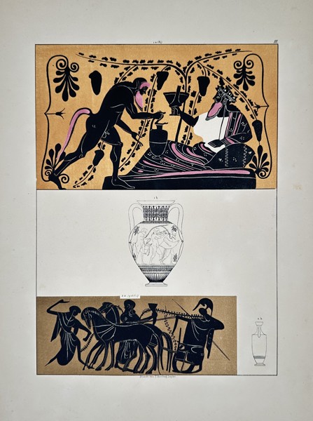 This print features three distinct illustrations copied from Ancient Greek pottery, intended for a scholarly publication cataloging classical antiquities. The upper panel, executed in the black-figure style, depicts a reclining figure engaged in a symposium, being served by an attendant. The middle section shows a detailed line illustration of a vase shape with red-figure decoration, and the lower panel, also in black-figure style, illustrates a chariot being prepared for a race or departure.