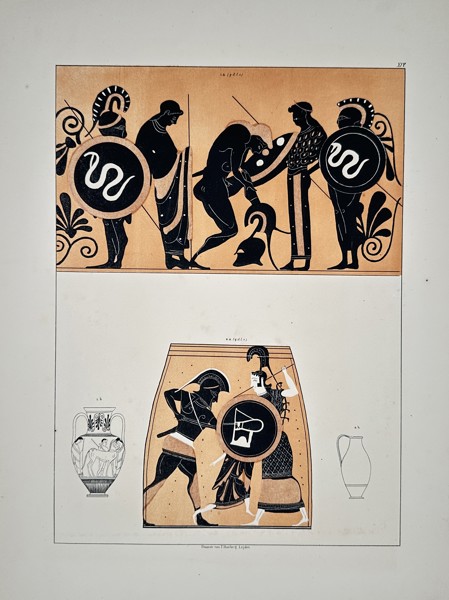 This print displays multiple scenes copied from Ancient Greek vases, executed in the black-figure technique and produced as a 19th-century facsimile. The upper panel depicts a row of warriors, two of whom hold large shields decorated with a prominent snake emblem, suggesting a scene of arming or preparation for battle. The lower panel shows a separate martial scene, featuring a warrior in combat gear. These illustrations document the iconography of warfare and heroism prevalent in ancient Greek pottery.