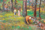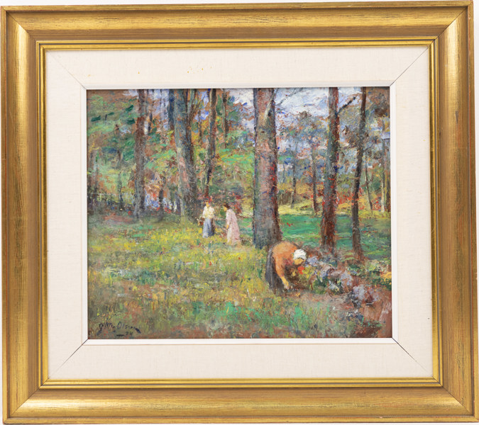 Gottfrid Olsson, olja på pannå, motiv med kvinnor i bärskog, daterad -74, signerad, mått med ram ca 67 x 60 cm