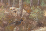 Johannes Ravn, olja på duk, motiv med tjäder, signerad, daterad -49, mått med ram ca 79 x 68 cm