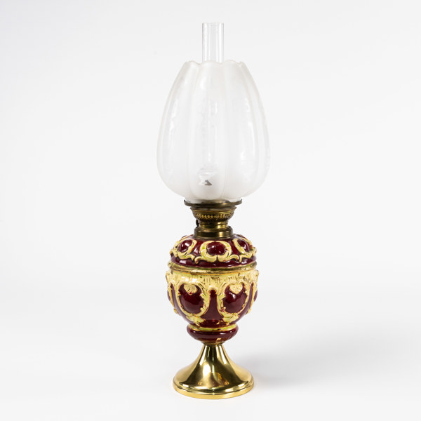Fotogenlampa, keramik, glas och mässing, tidigt 1900-tal, höjd 55 cm