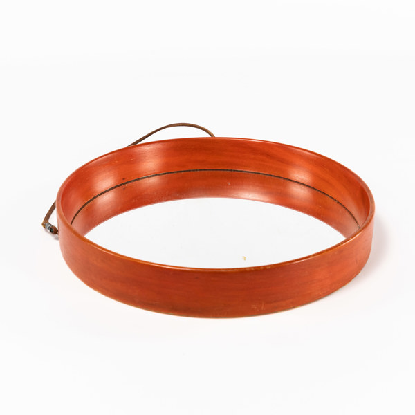 Rund väggspegel med upphängning i läder, rund, ca 1960-tal, diameter 29,5 cm