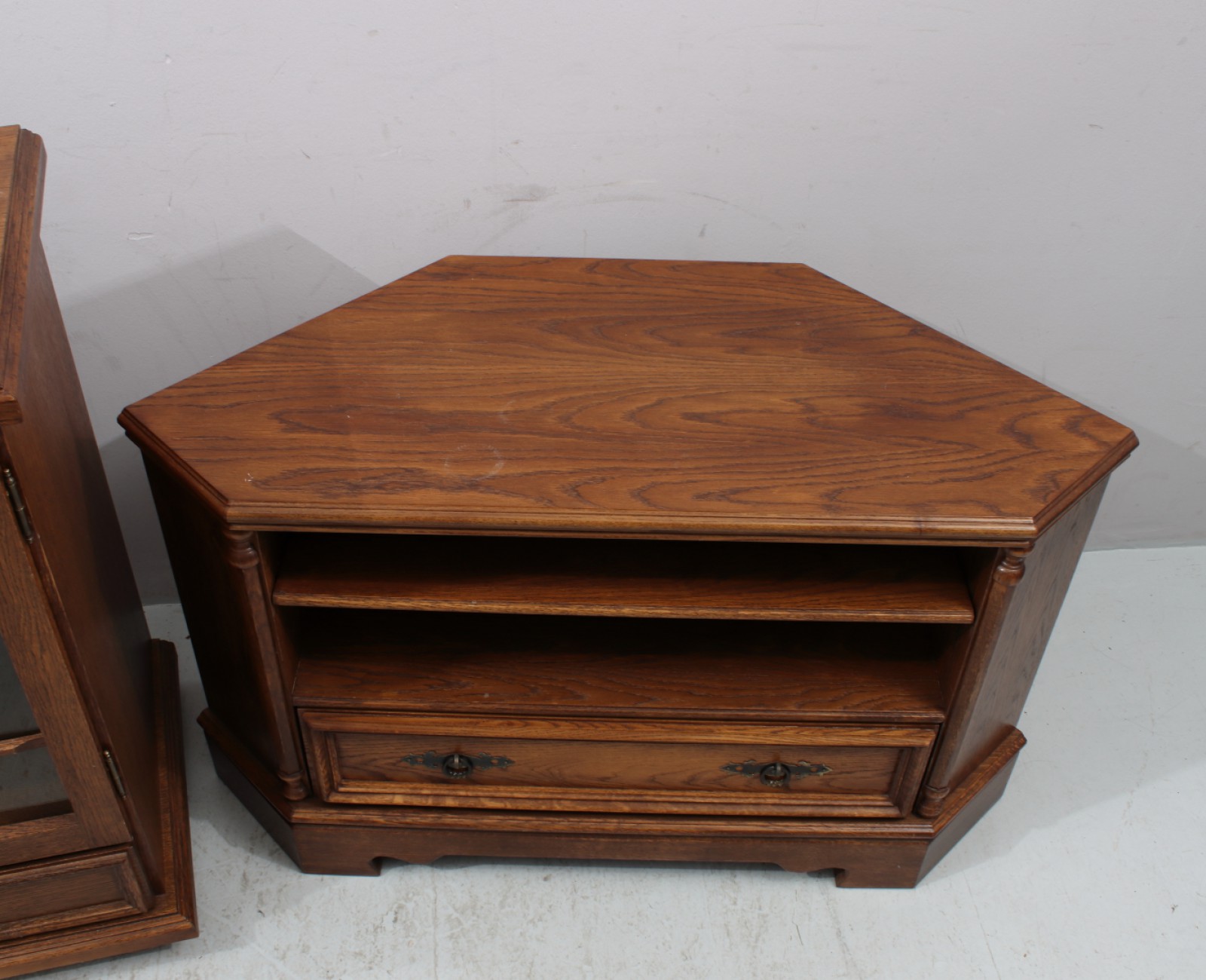 2 delar, 1st tv-bänk hörnmodell samt 1st mediaskåp med vitrin, 1900-talets senare del, H.61-85, B.75-104, Dj.45 cm. (vån1)
