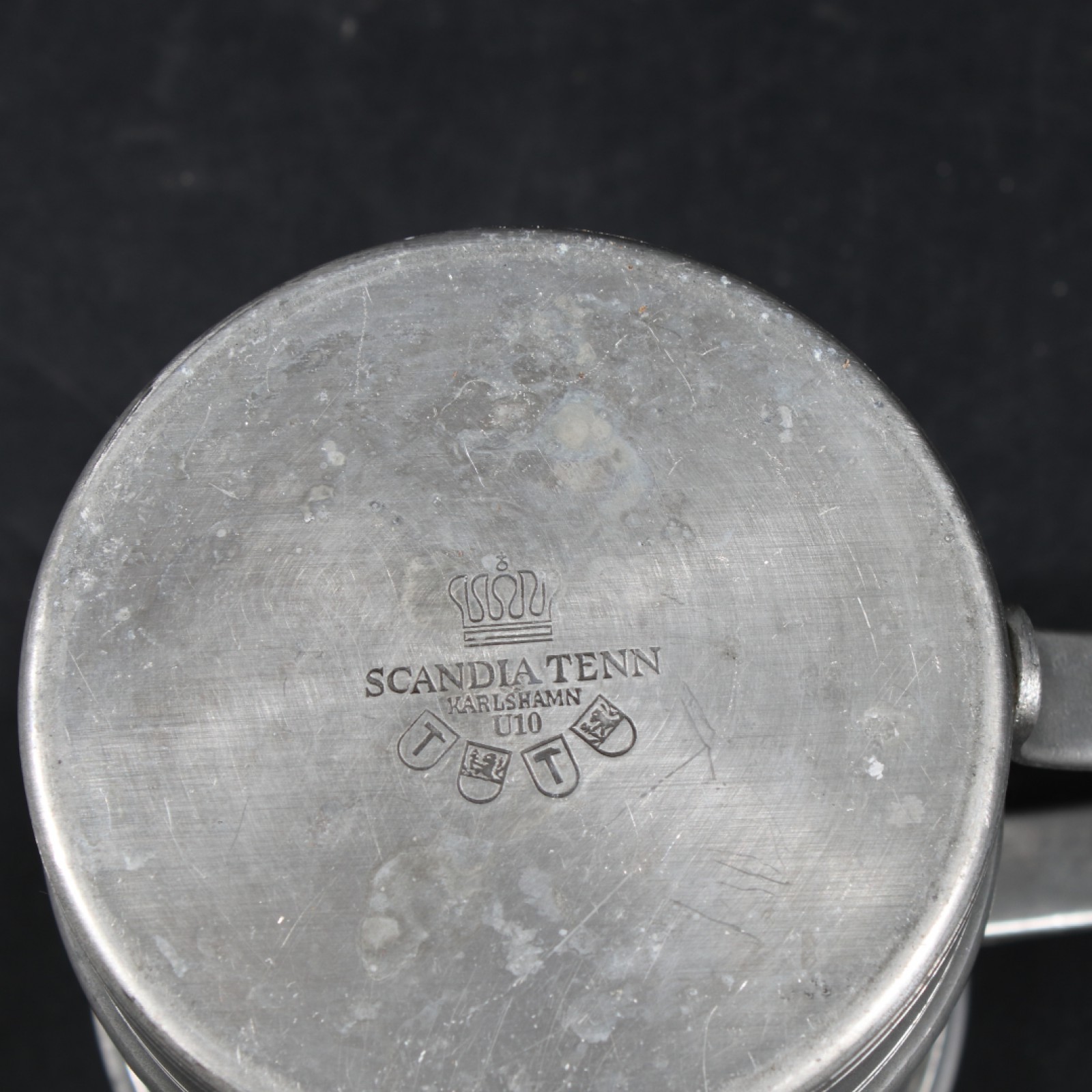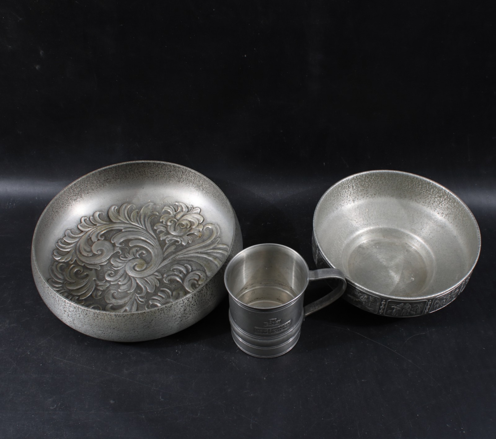 3 delar, tenn, 1st Scandia Tenn ölstop samt 2st Eik Tinn skålar, höjd 7-10 cm, diameter 12-24 cm, vikt 2,15 kg. (vån3)