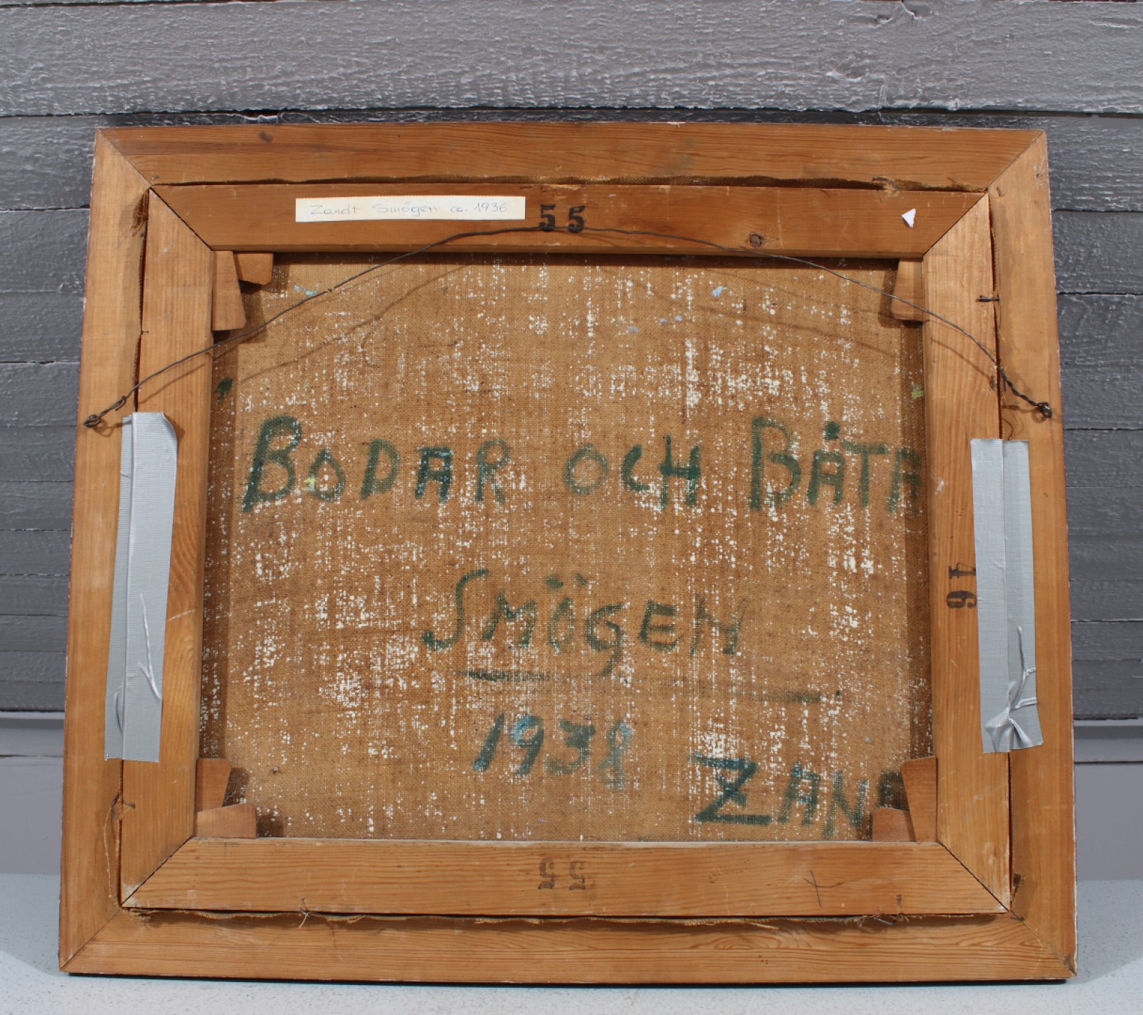 olja på duk, "Bodar och båtar, Smögen 1938", ram 55,5x64,5 cm, bild 45x54 cm. (vån3)