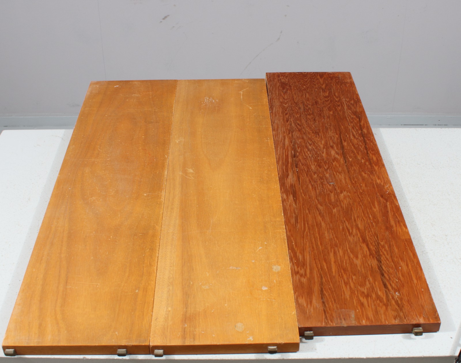 3 stycken hyllplan (1st fanerad med teak samt 2st fanerade med annat träslag), 3st gavlar i plastad metall (2st vita samt 1st svart), 1960-tal, åldersrelaterat slitage, hyllplan 78x20 cm, gavlar höjd 75 cm. (vån3)