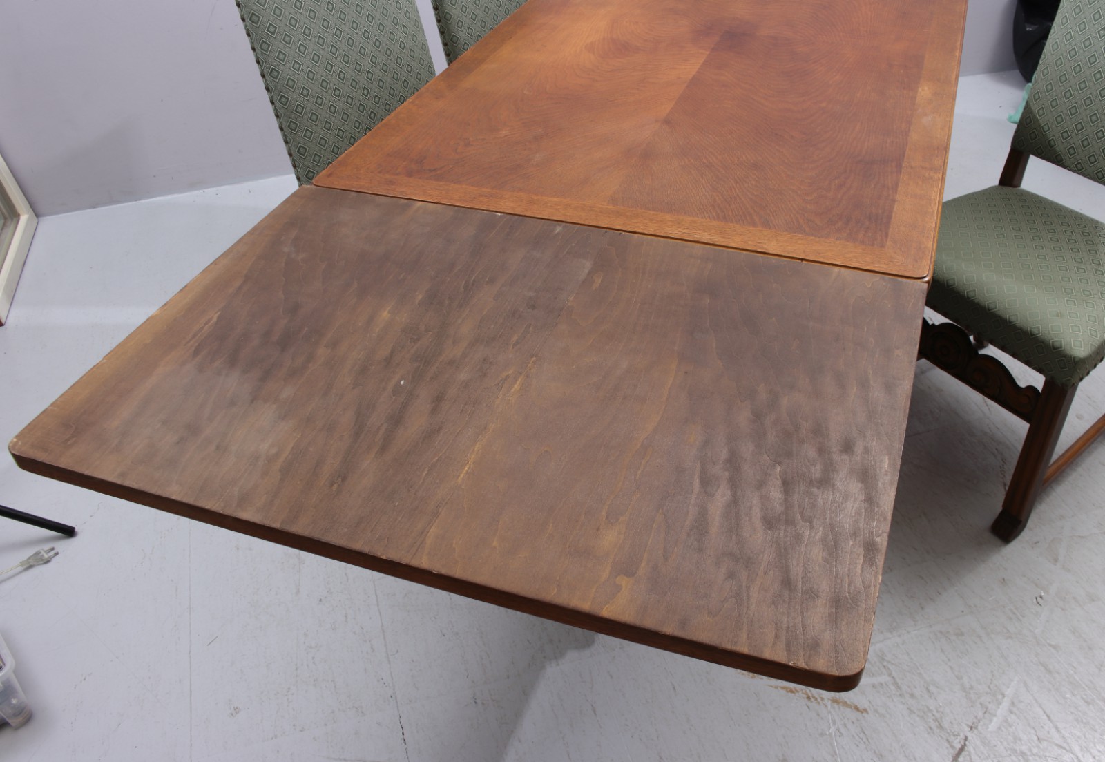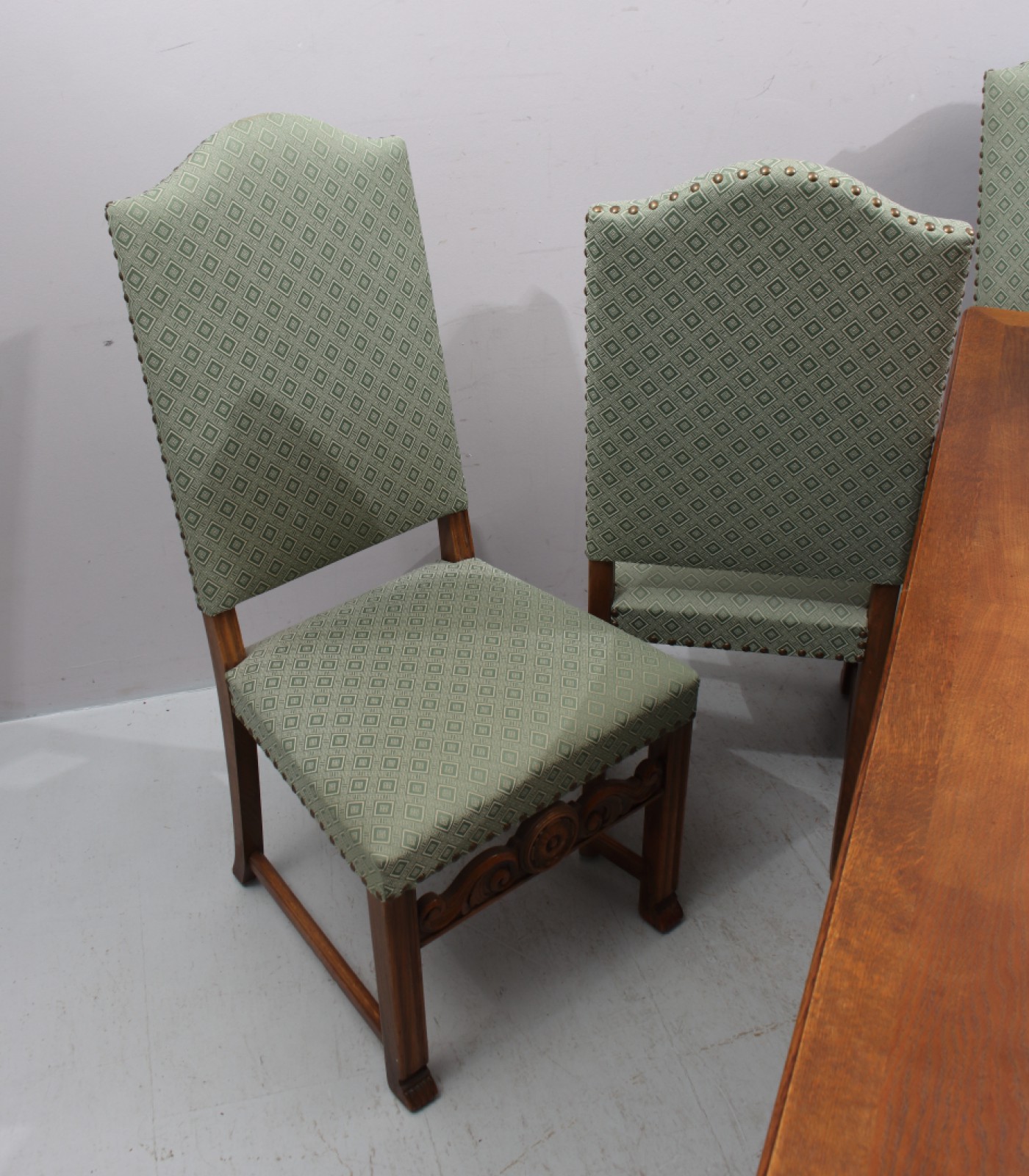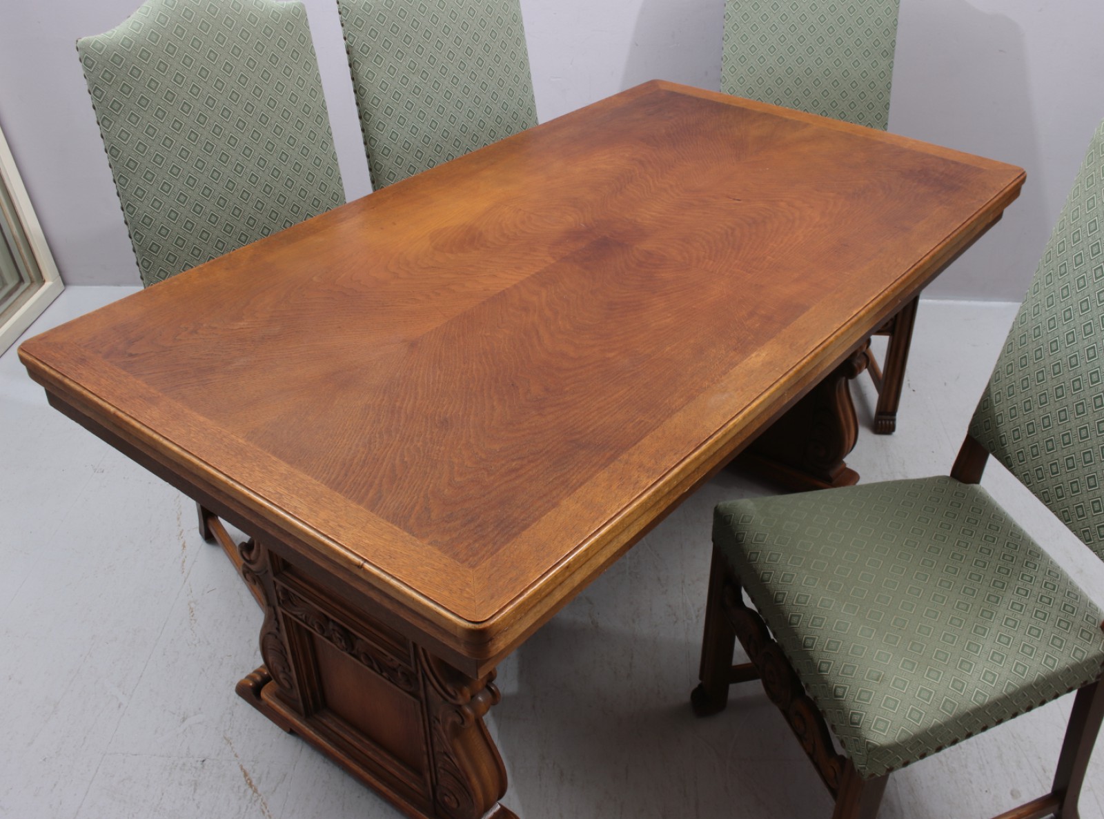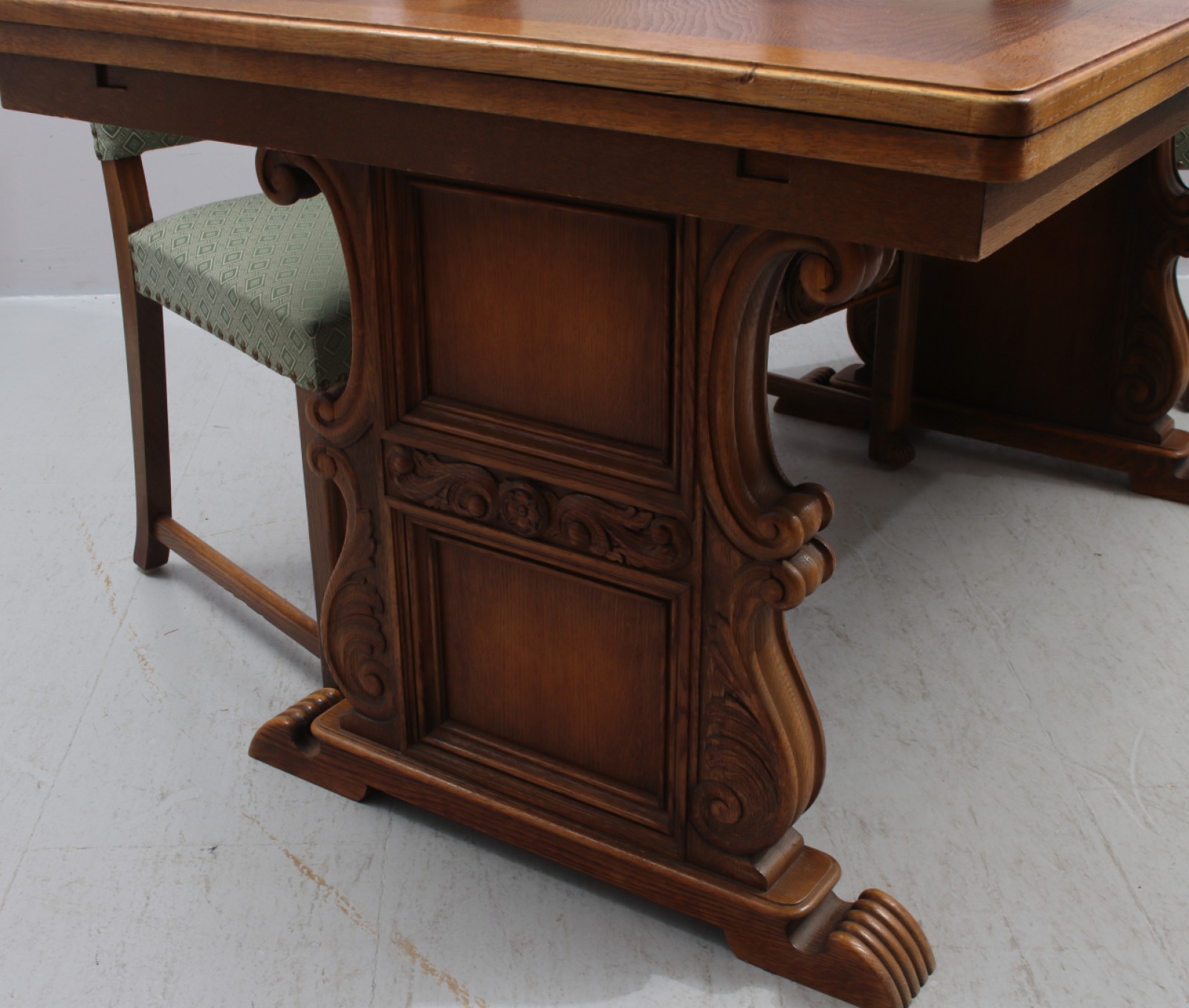 5 delar, trä, bord med skurna gavlar, h.75cm, bredd 150+57+57cm, djup 84,5cm. 4 stolar Rh:107cm B:48,5cm Sh:45cm (Vån1)