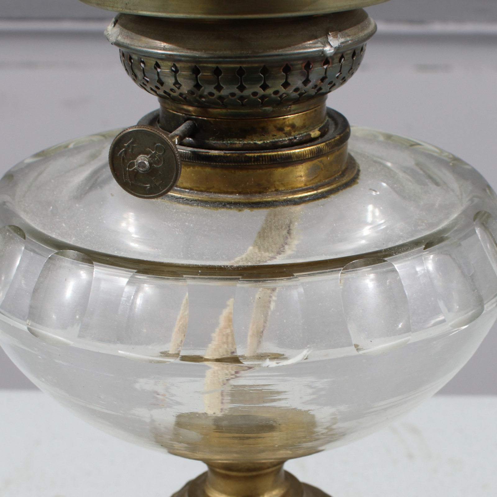 Fot i gjuten metall, oljehus i glas med slipad dekor, skärm i frostat glas samt brännarrör i glas, höjd 55 cm. (vån3)