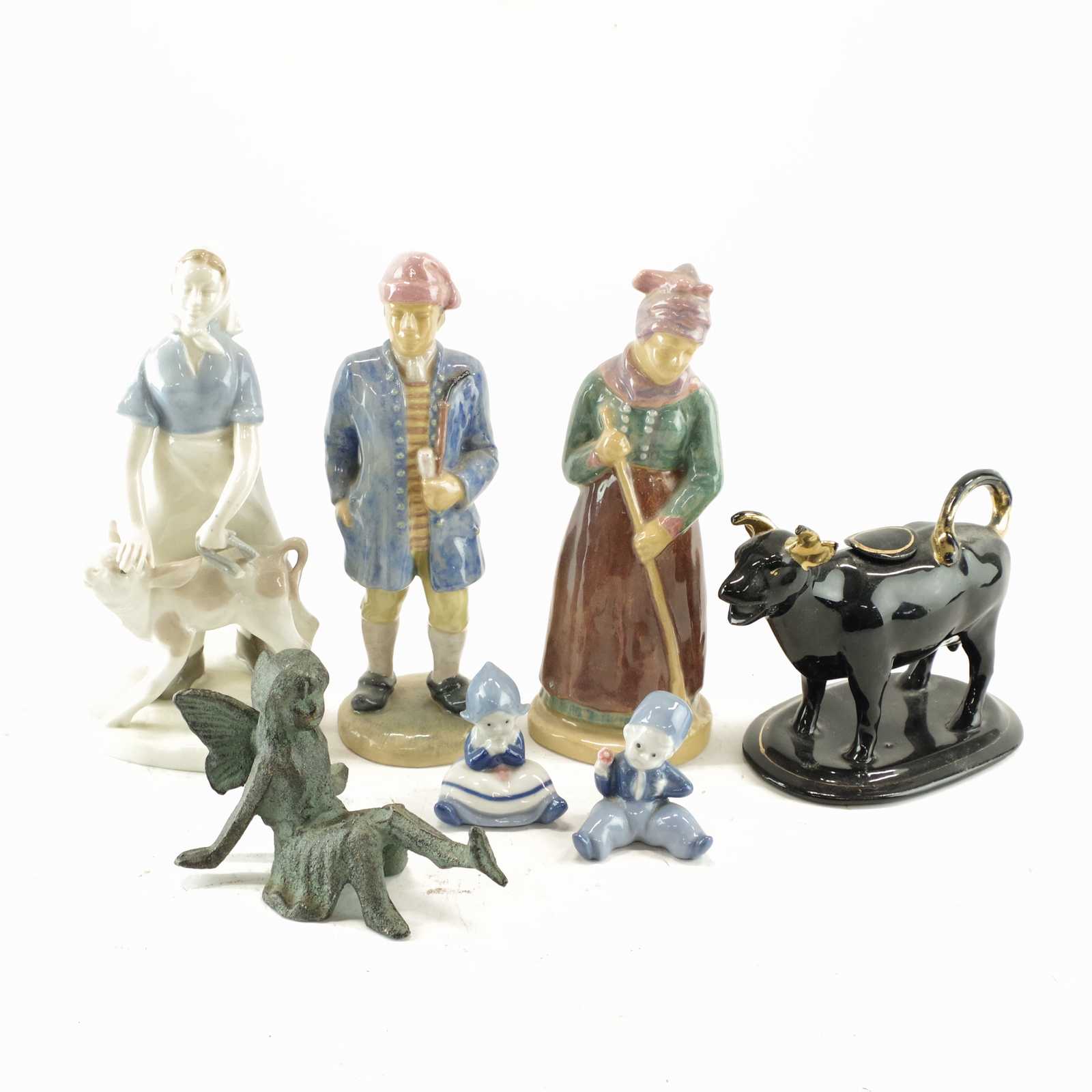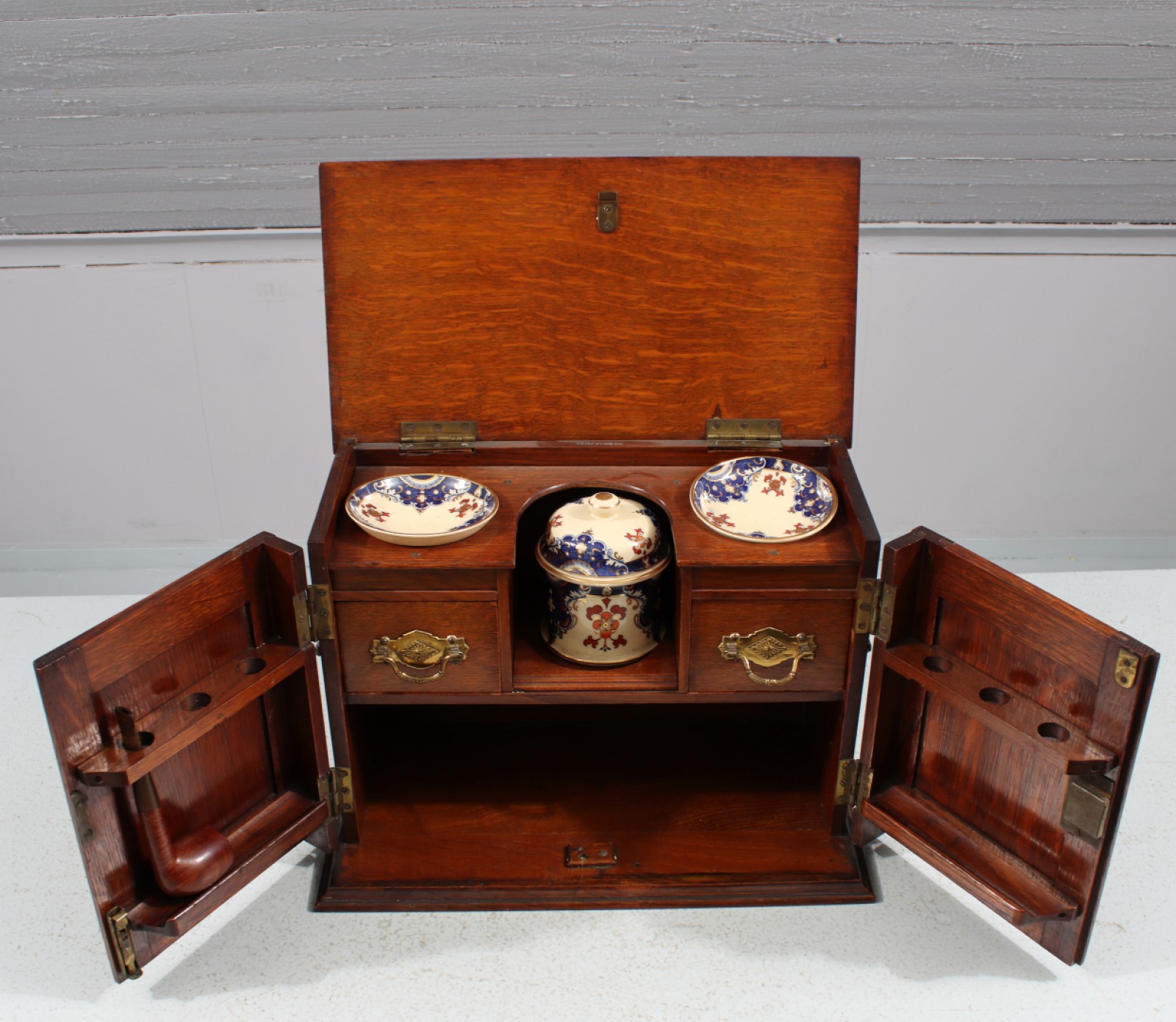 Ek, Tobaksburk med lock samt 2st askfat i lergods, dörrfronter med skuren dekor, 1900-talets första hälft, 1st Lillehammer GL pipa medföljer, H.27,5, B.36,5, Dj.20 cm. (vån3)