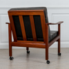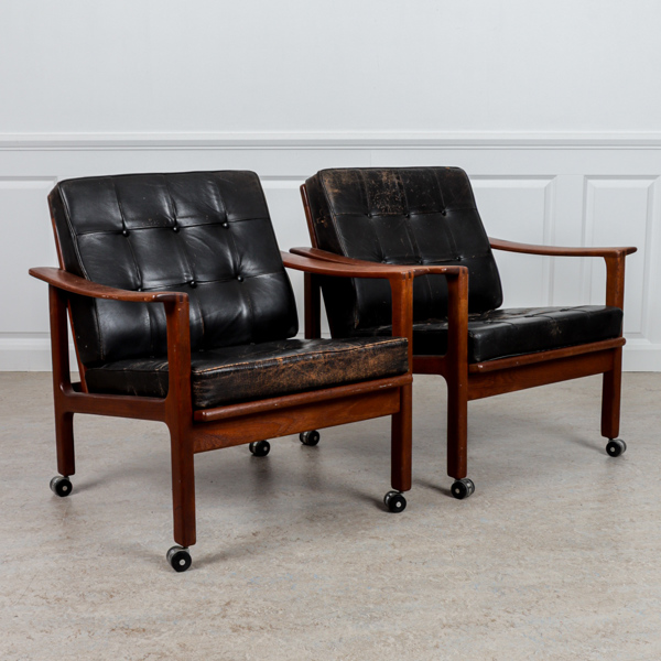 Fåtöljer med lösa plymåer i läder. Stomme i teak.