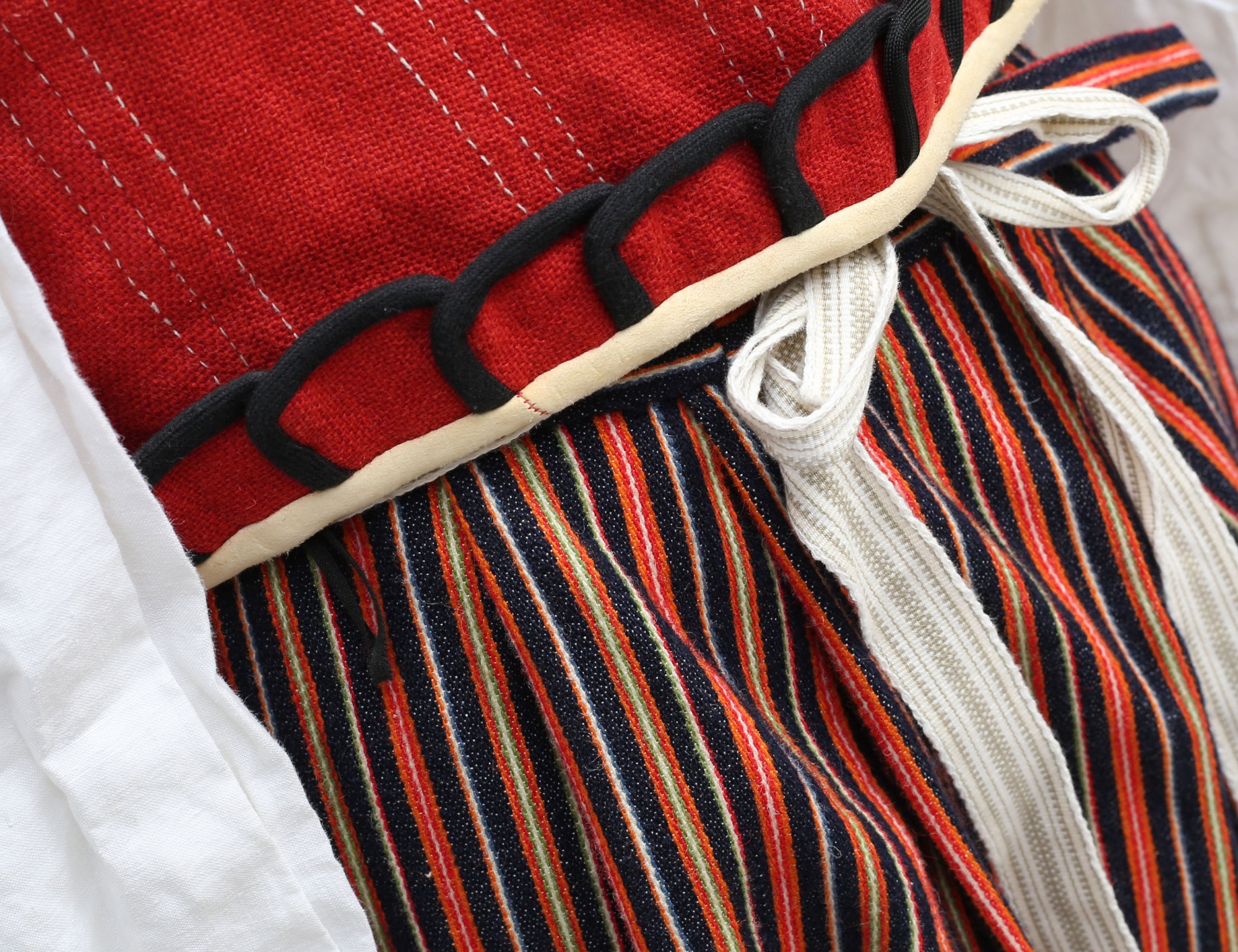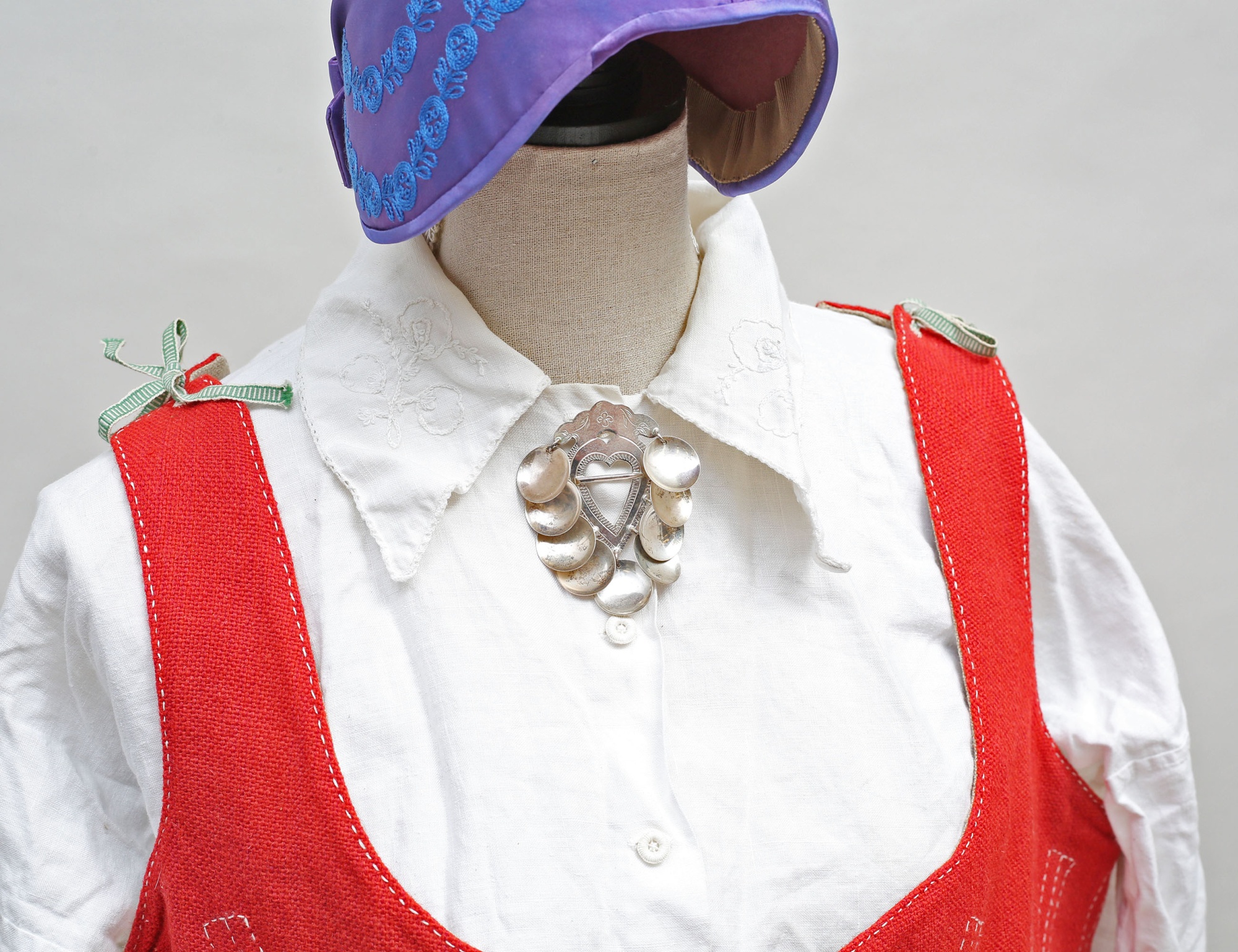 Östergötland 1980-tal, blus, underkjol, kjol, väst, väska, hätta, dräktsmycke "Smycket" Christer Tornby Unnaryd 1980, storlek L/XL (extra kragar medföljer)