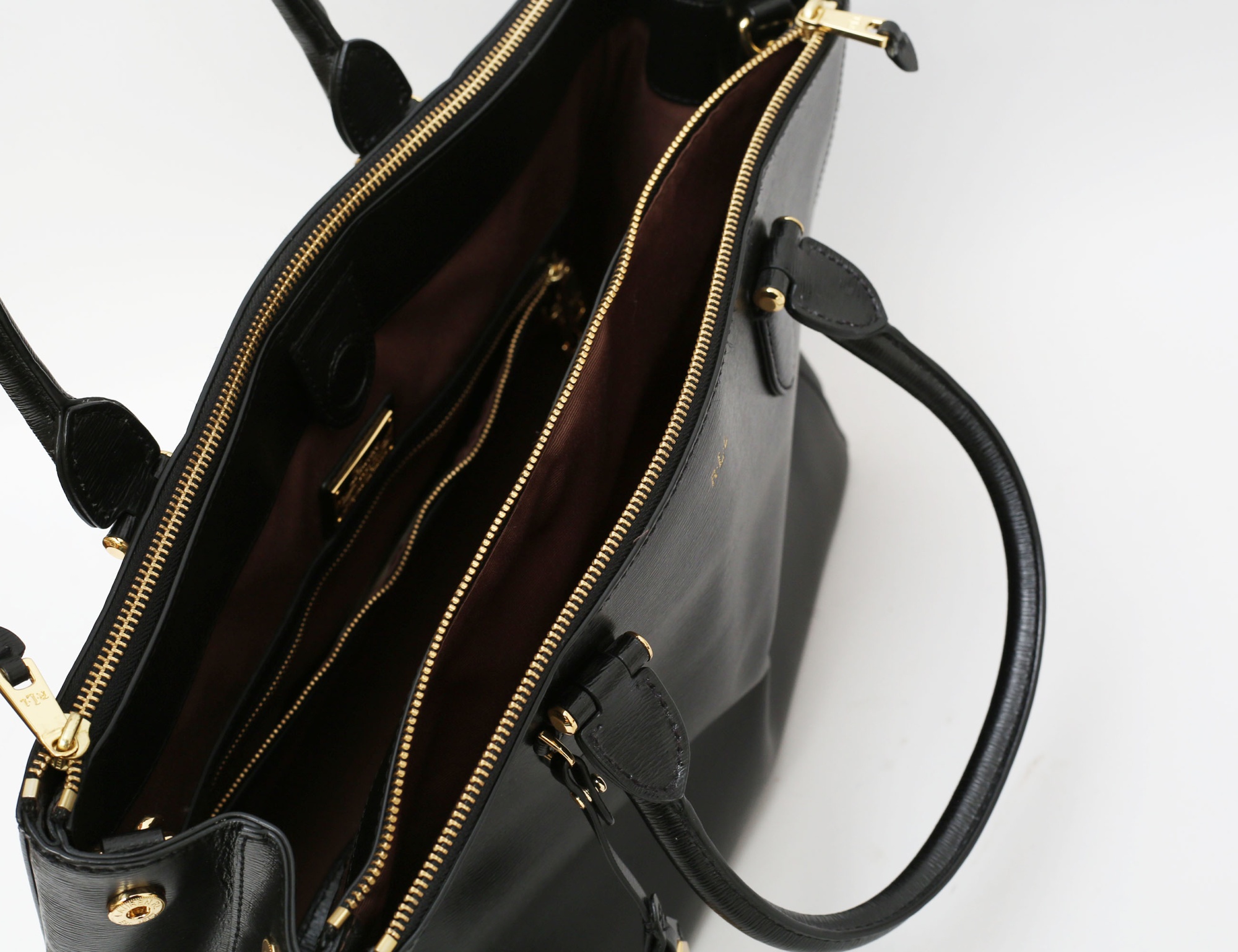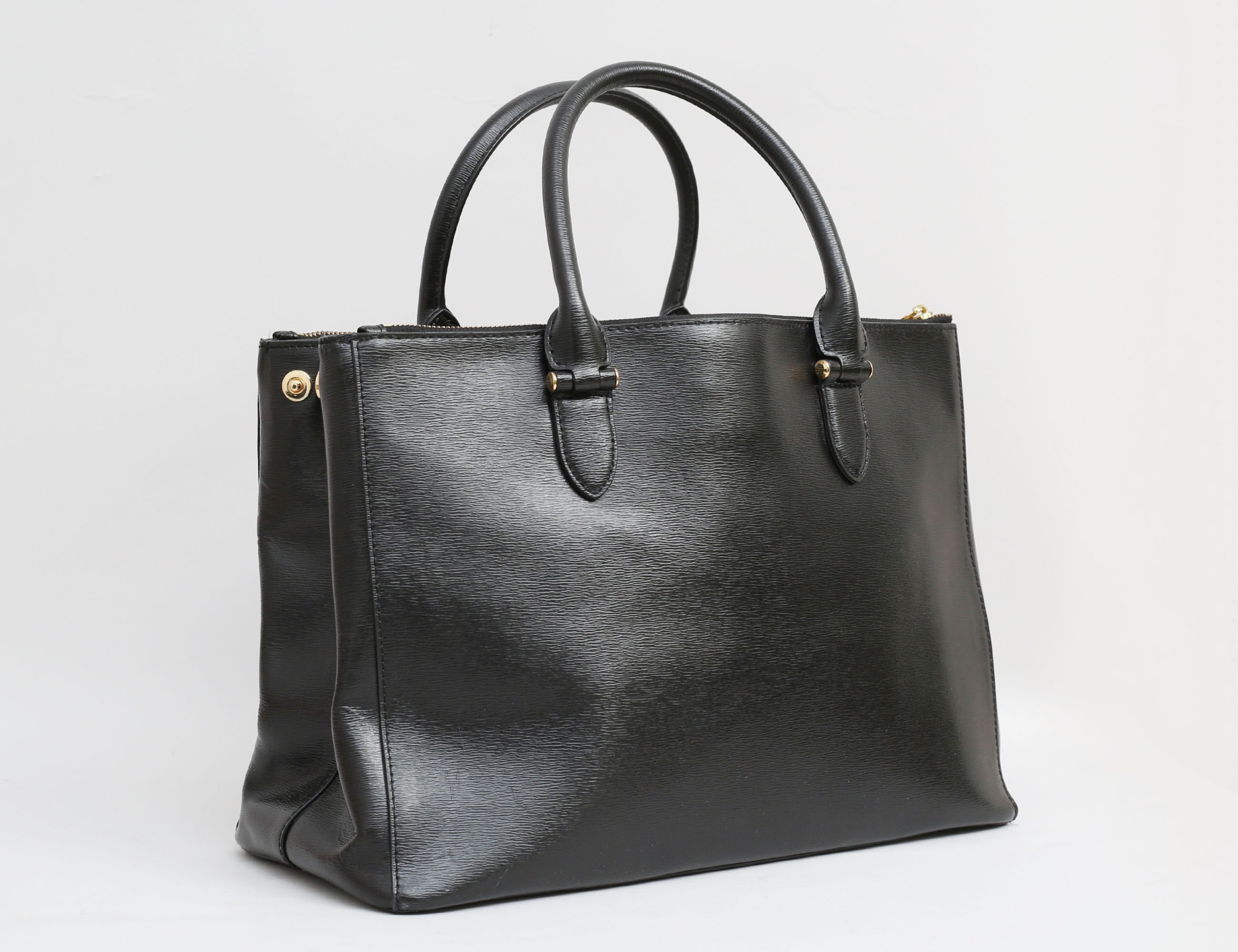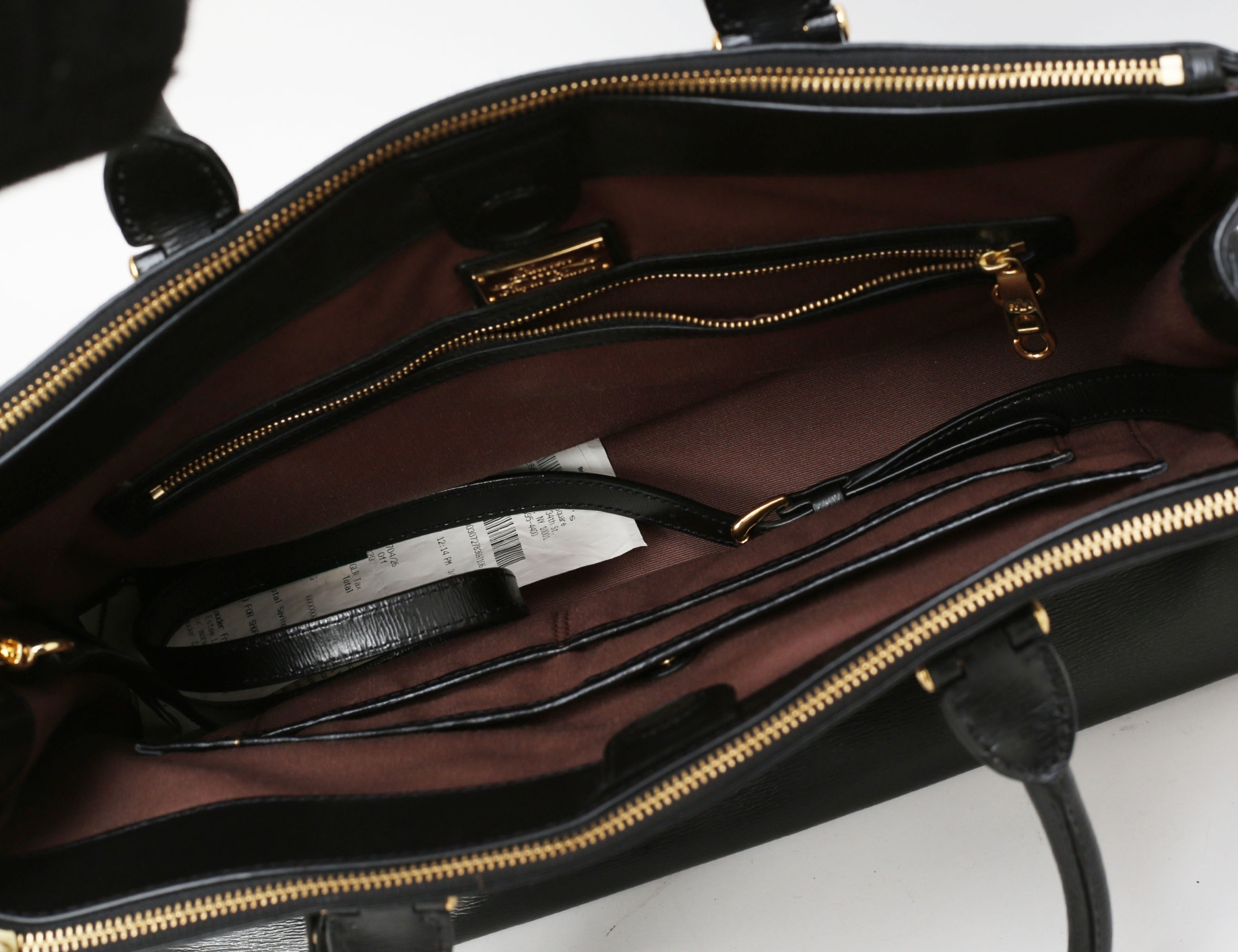 handväska svart läder, mässingsdetaljer, handtag samt axelrem, dustbag, tags och kvitto medföljer, närmast nyskick, höjd 26, bredd 38x15