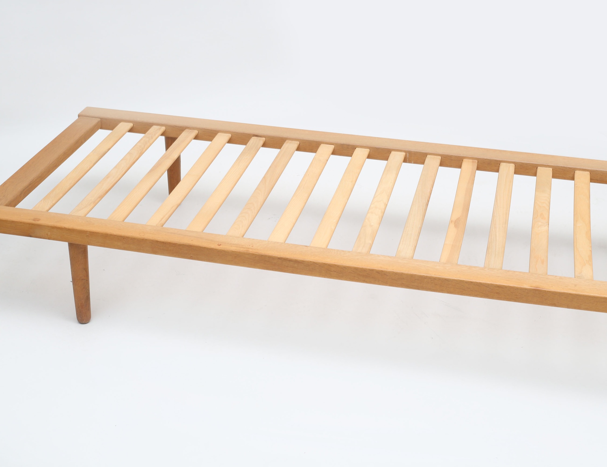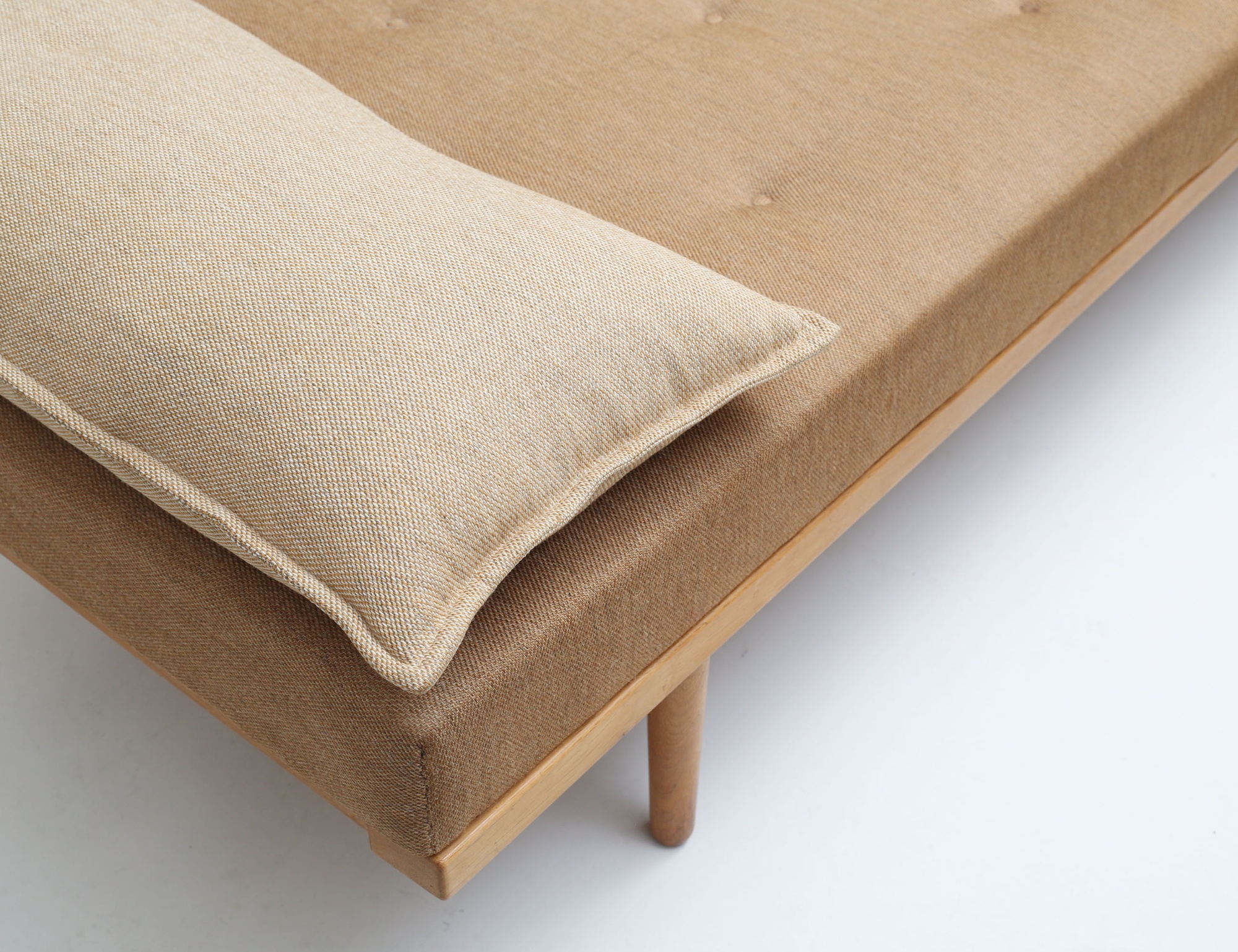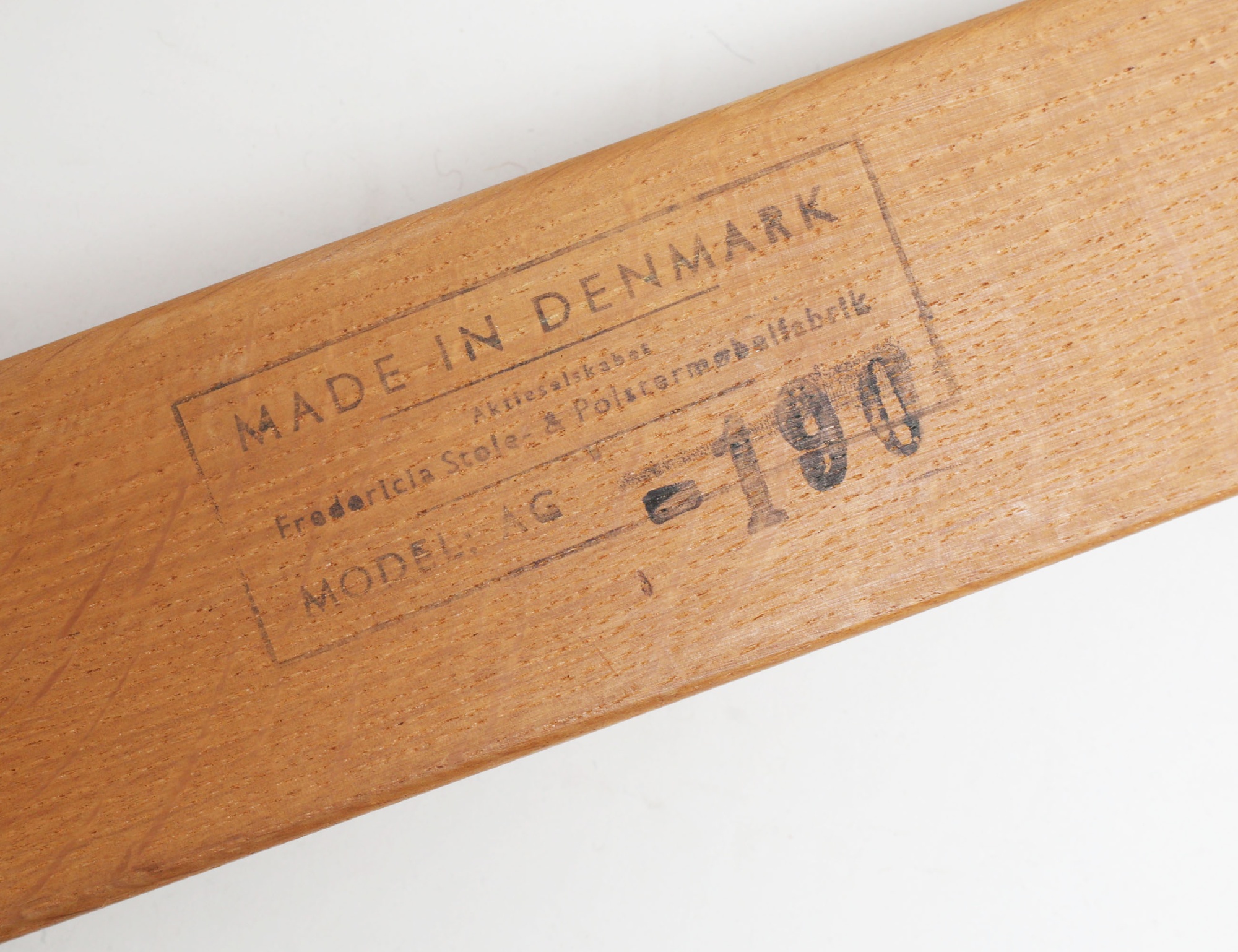 modell AG 190, Fredericia Stolefabrik Danmark, ek, lös dyna samt kudde, brännstämpel, höjd 40, längd 195x75 (smärre fläckar)
