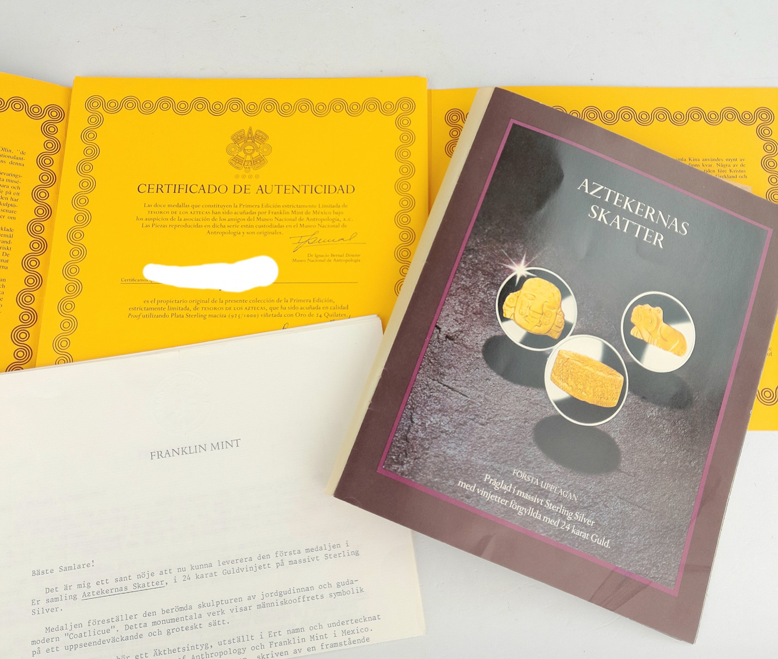 FRANKLIN MINT, "AZTEKERNAS SKATTER"- 12 KONSTMEDALJER I SILVER OCH GULD