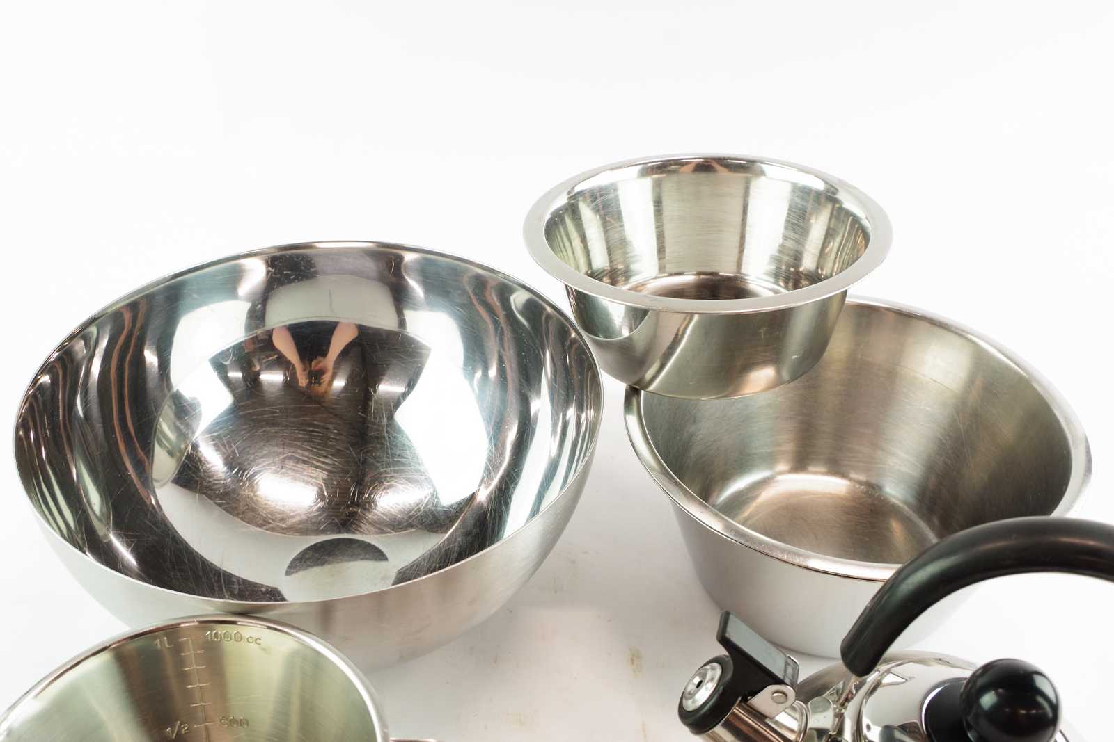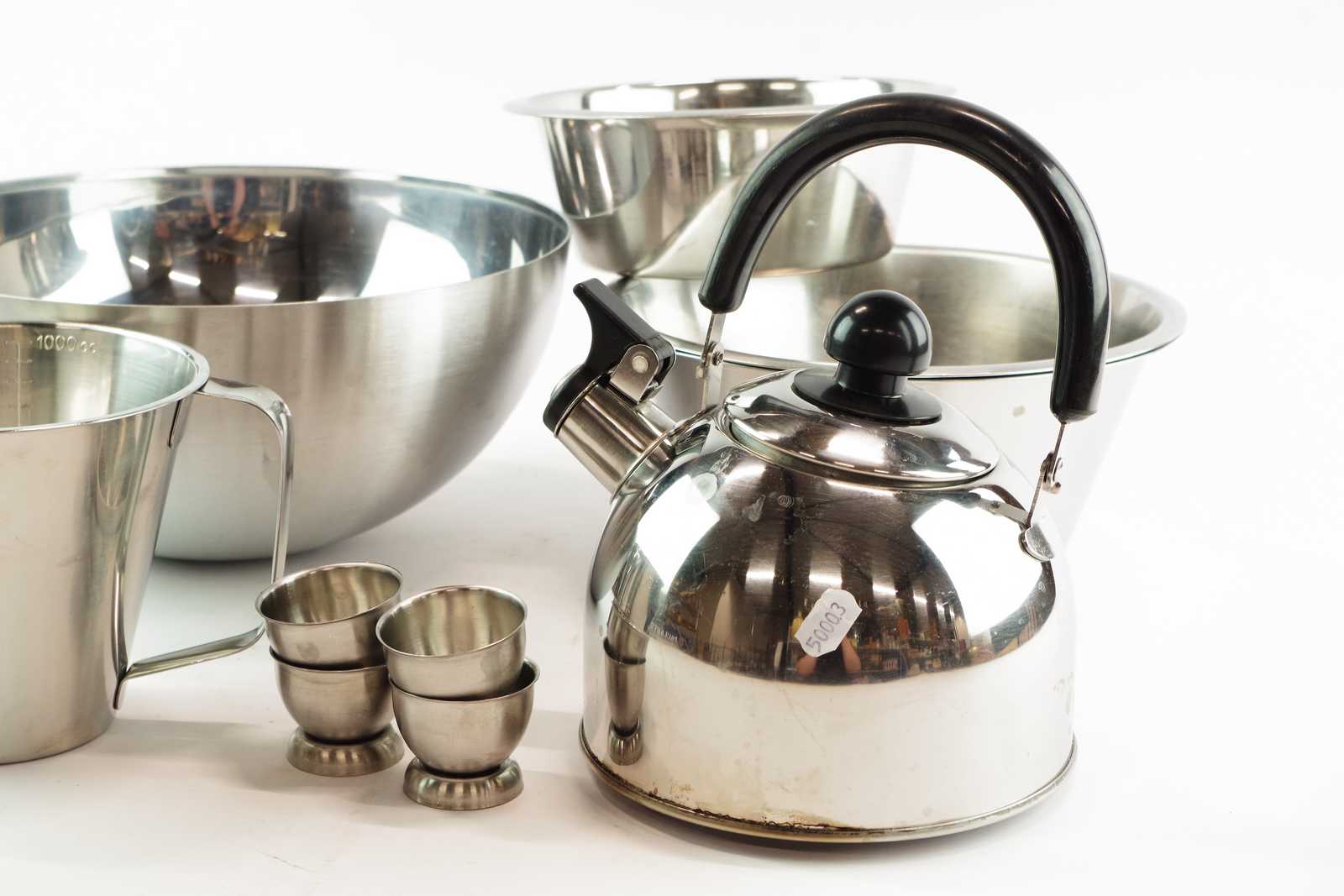 Bilder parti ROSTFRITT äggkoppar, mått, bunkar och visselkanna