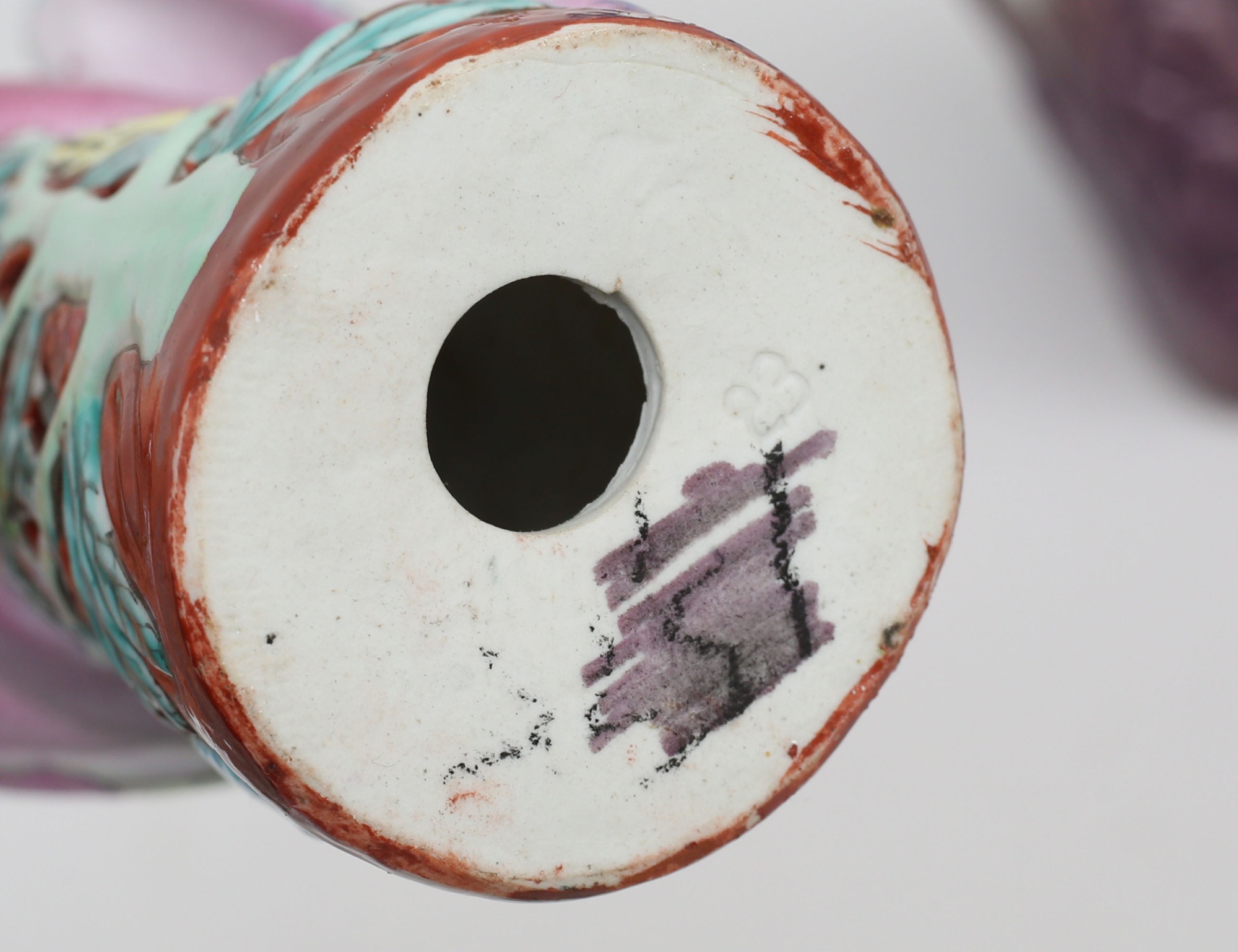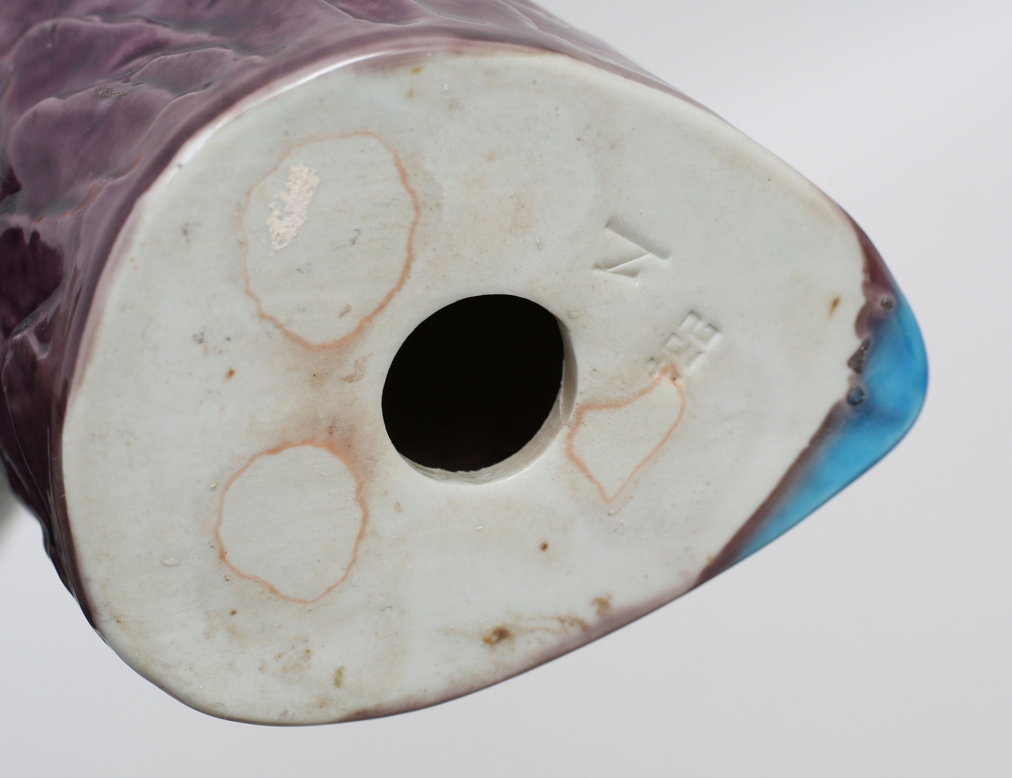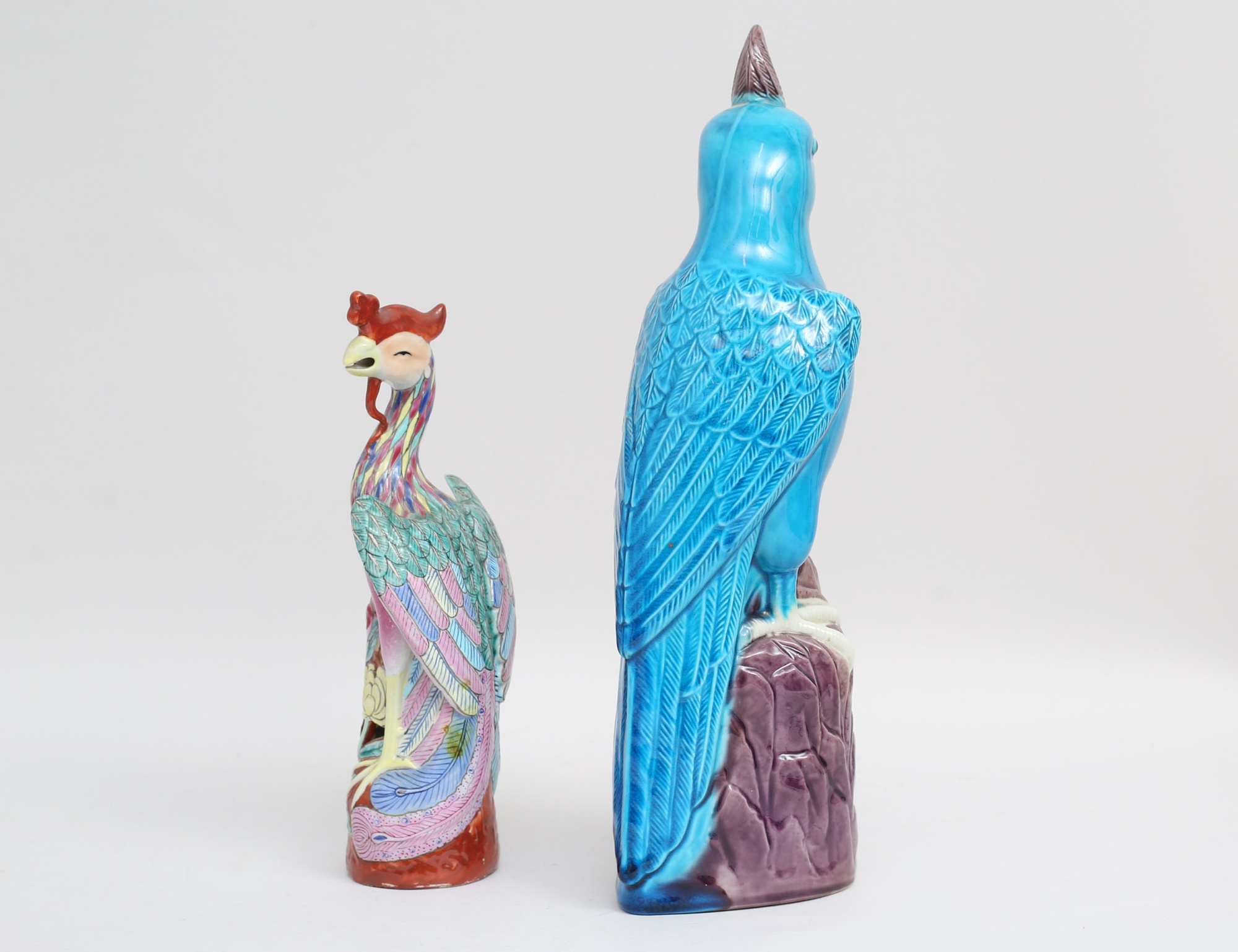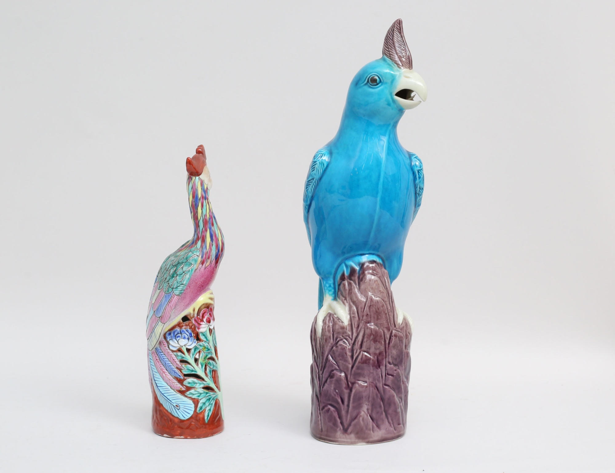 porslin, papegoja på stubbe, turkos samt lila glasyr, fågel fenix, polykromt bemålad i famille rose färger, höjd 30/22