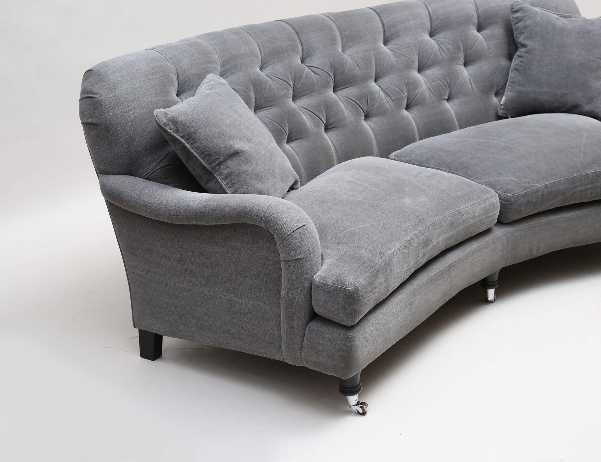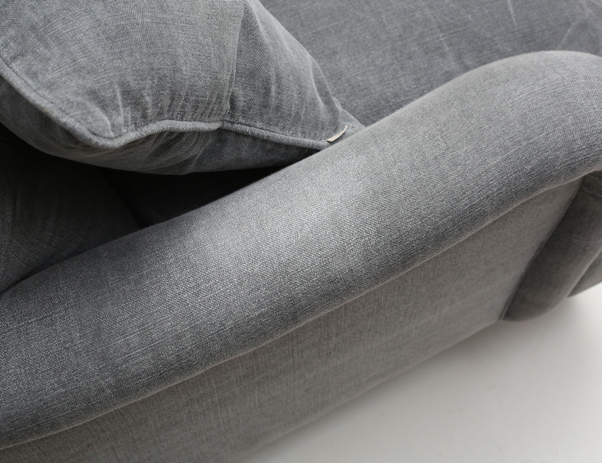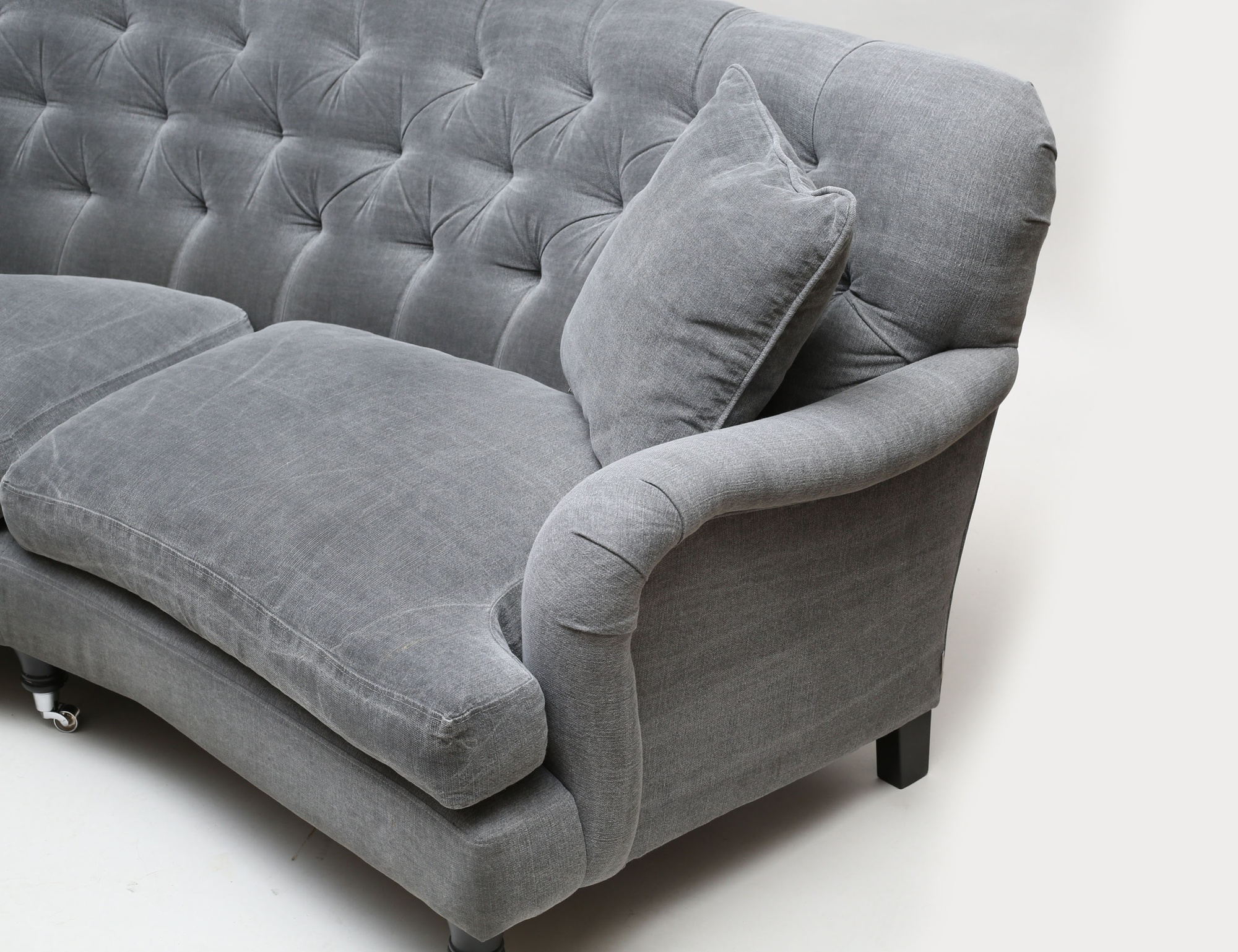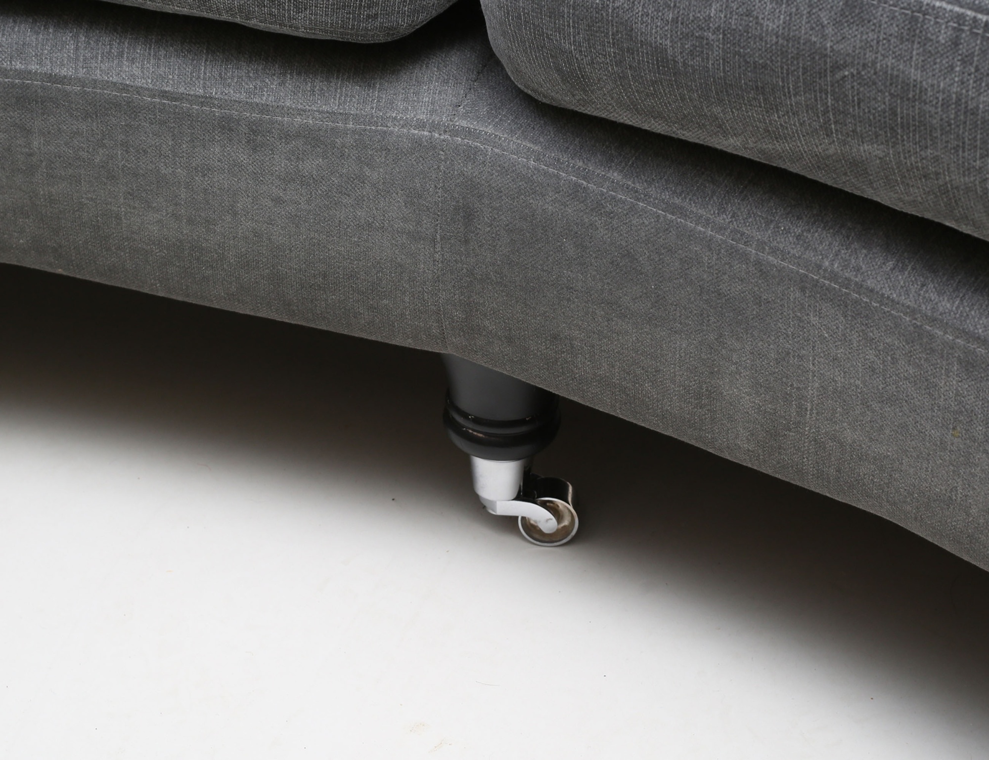 mörkgrå tygklädsel, hålstoppad rygg, två lösa prydnadskuddar, framben med hjultrissor, etikettmärkt, höjd 85, längd 210, djup 90 (smärre fläckar)