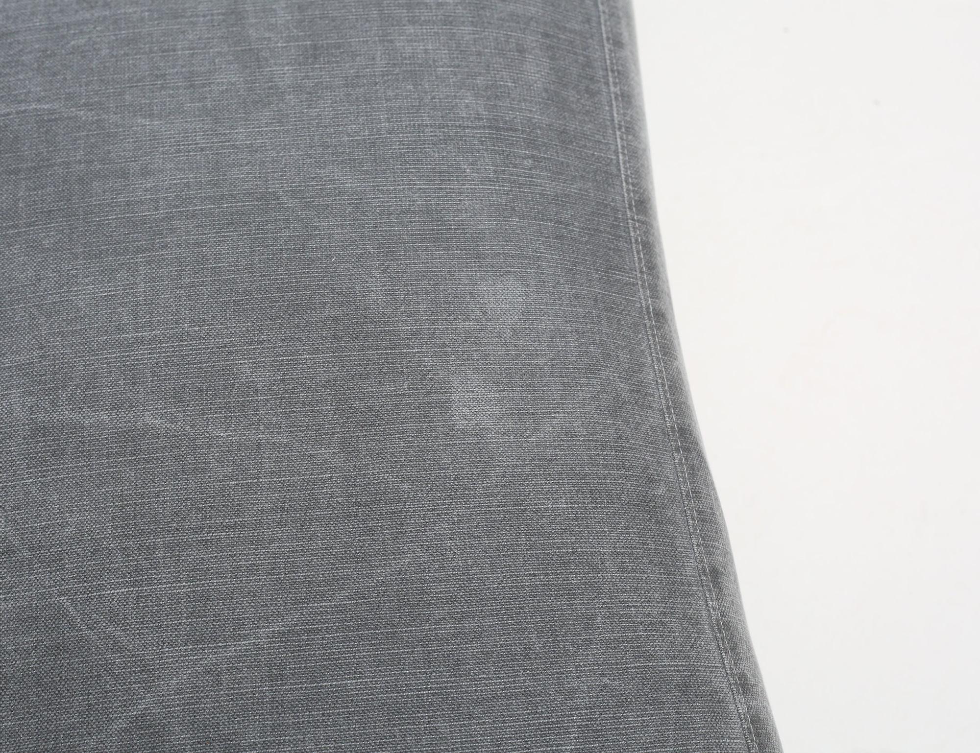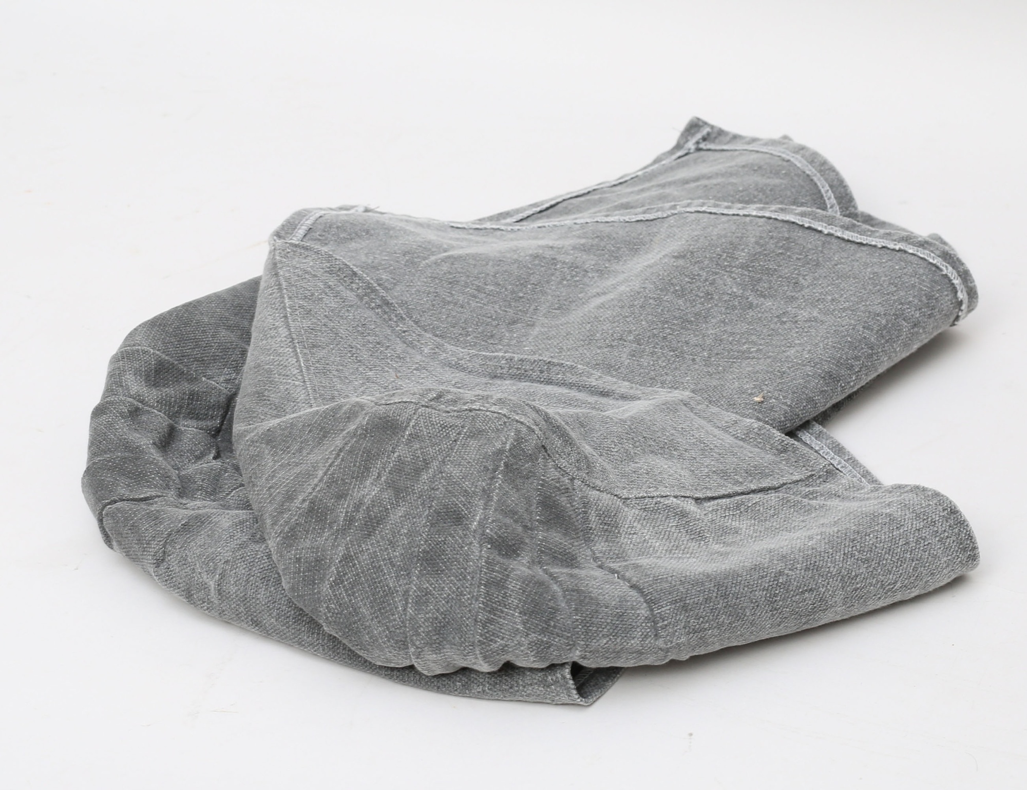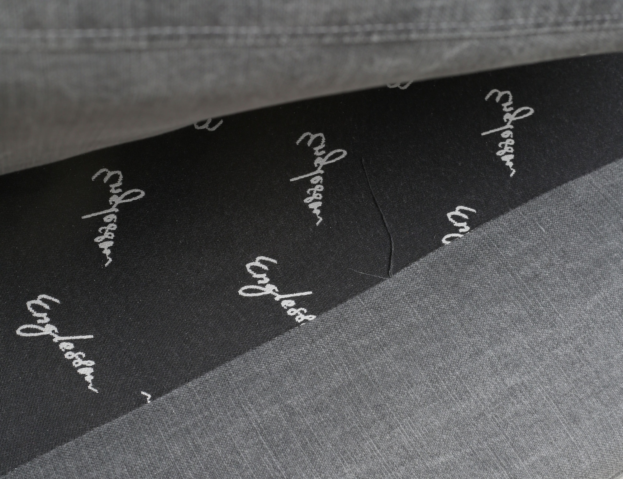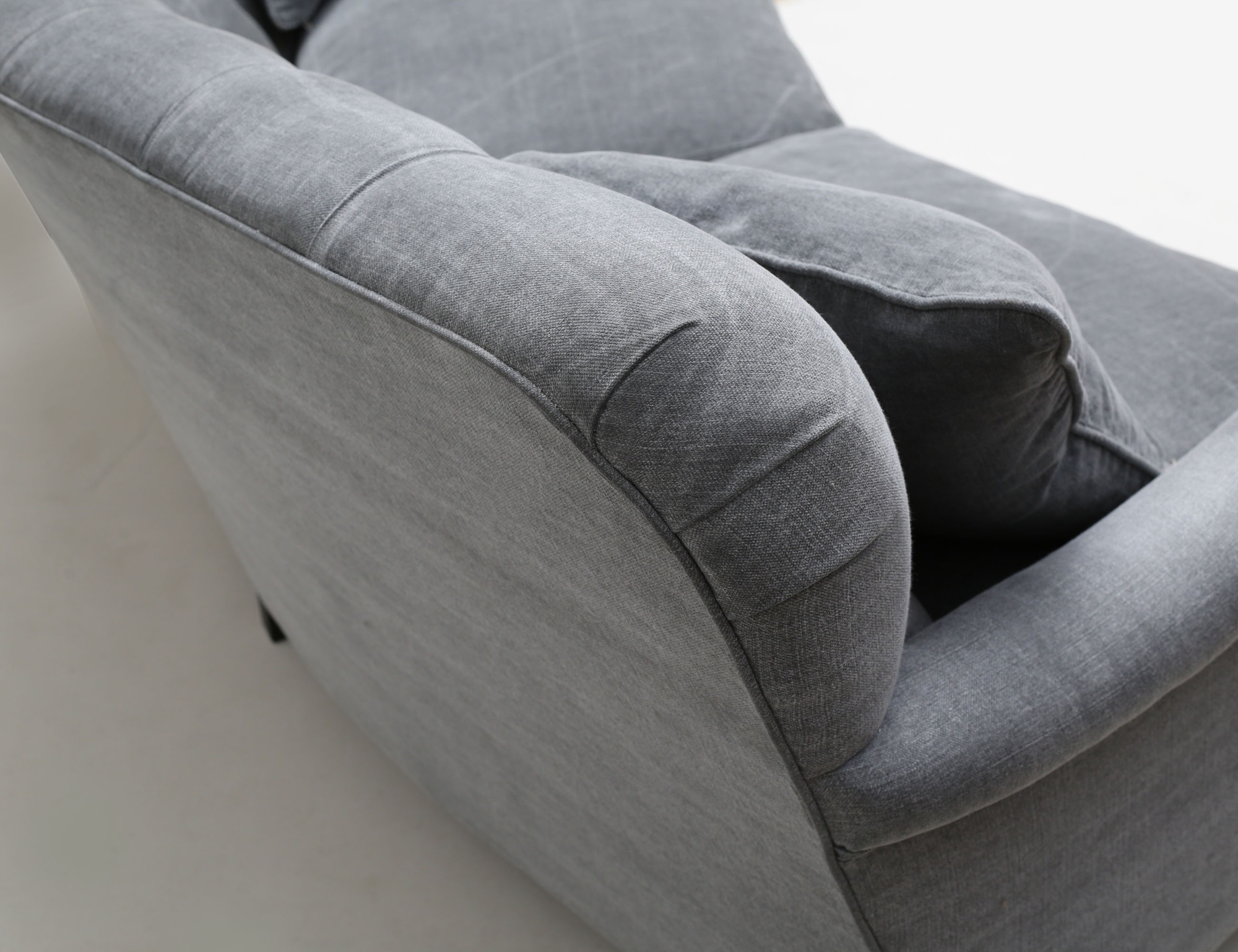 mörkgrå tygklädsel, hålstoppad rygg, två lösa prydnadskuddar, framben med hjultrissor, etikettmärkt, höjd 85, längd 210, djup 90 (smärre fläckar)