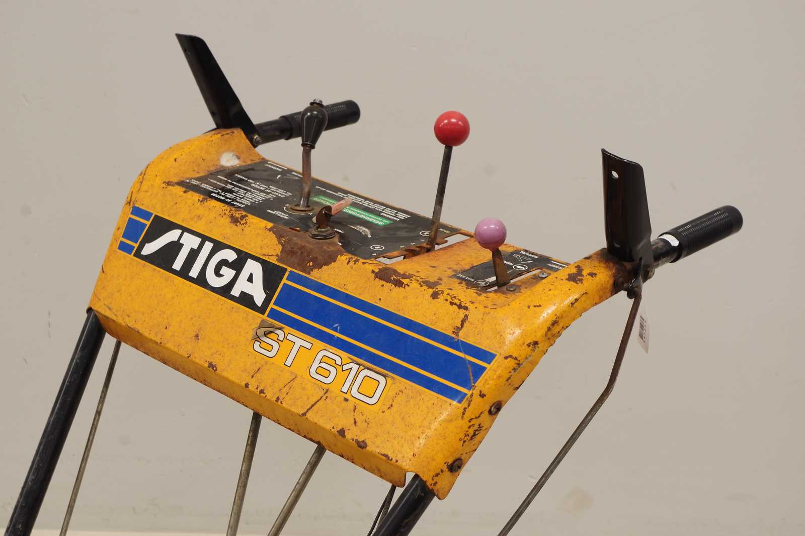 Auktioner SNĂSLUNGA, Stiga "ST 610", B: 61cm, snökedjor medföljer, ny förgasare, fungerar. (bruksslitage, rost)