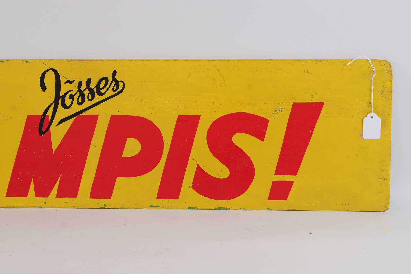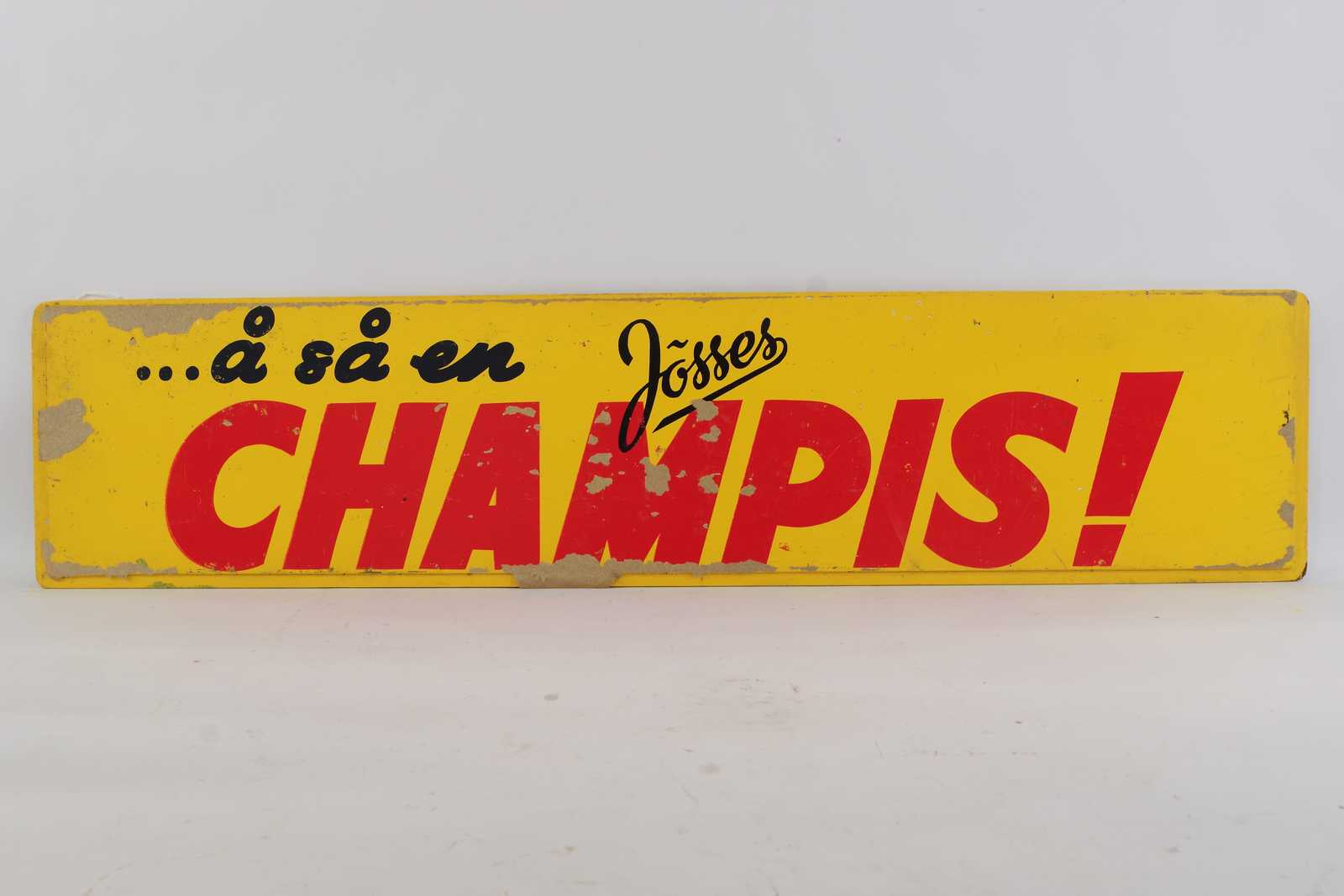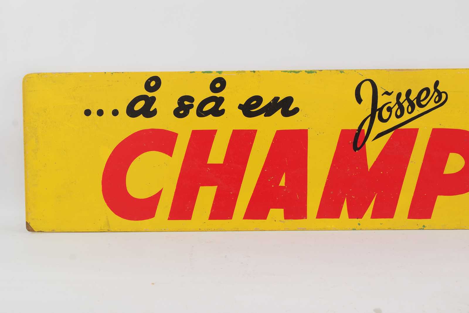 REKLAMSKYLT Jösses Champis, tvåsidig, tryckt på masonit, 1900 talets mitt. 110x25cm (slitage, färgbortfall)