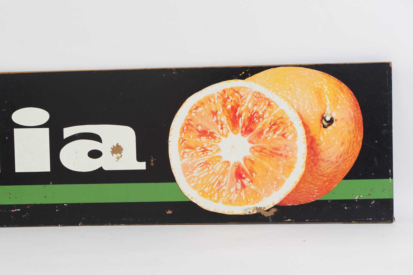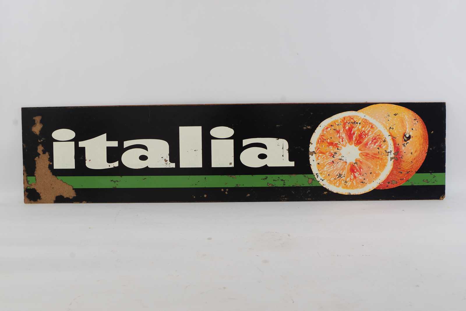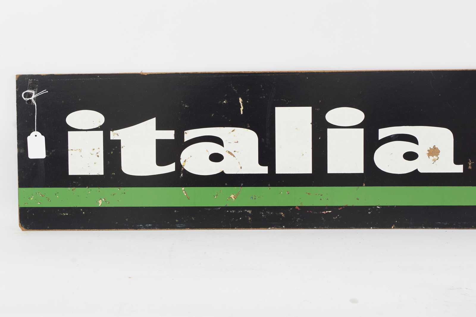 Bilder REKLAMSKYLT Italia, tvÄsidig, tryckt pÄ masonit, 1900 talets mitt. 110x25cm (slitage, tryckbortfall)