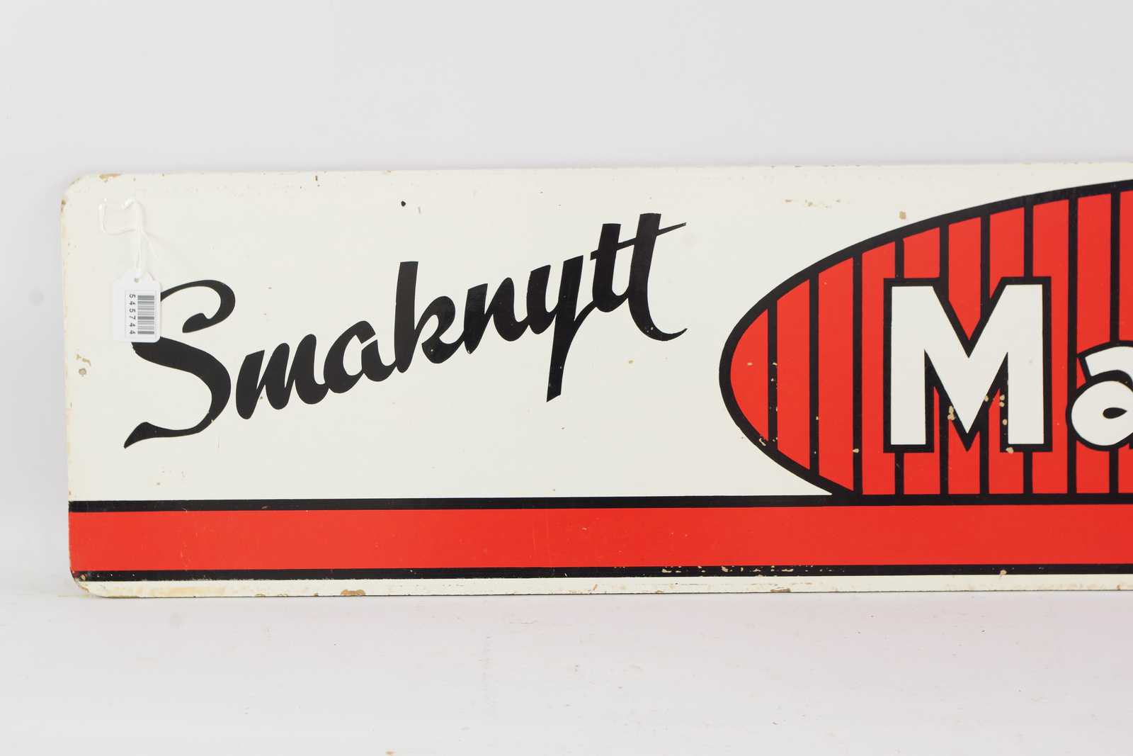 Bilder REKLAMSKYLT Mandarin Smaknytt, tvåsidig, tryckt på masonit, 1900 talets mitt. 110x25cm (slitage, färgbortfall förekommer)