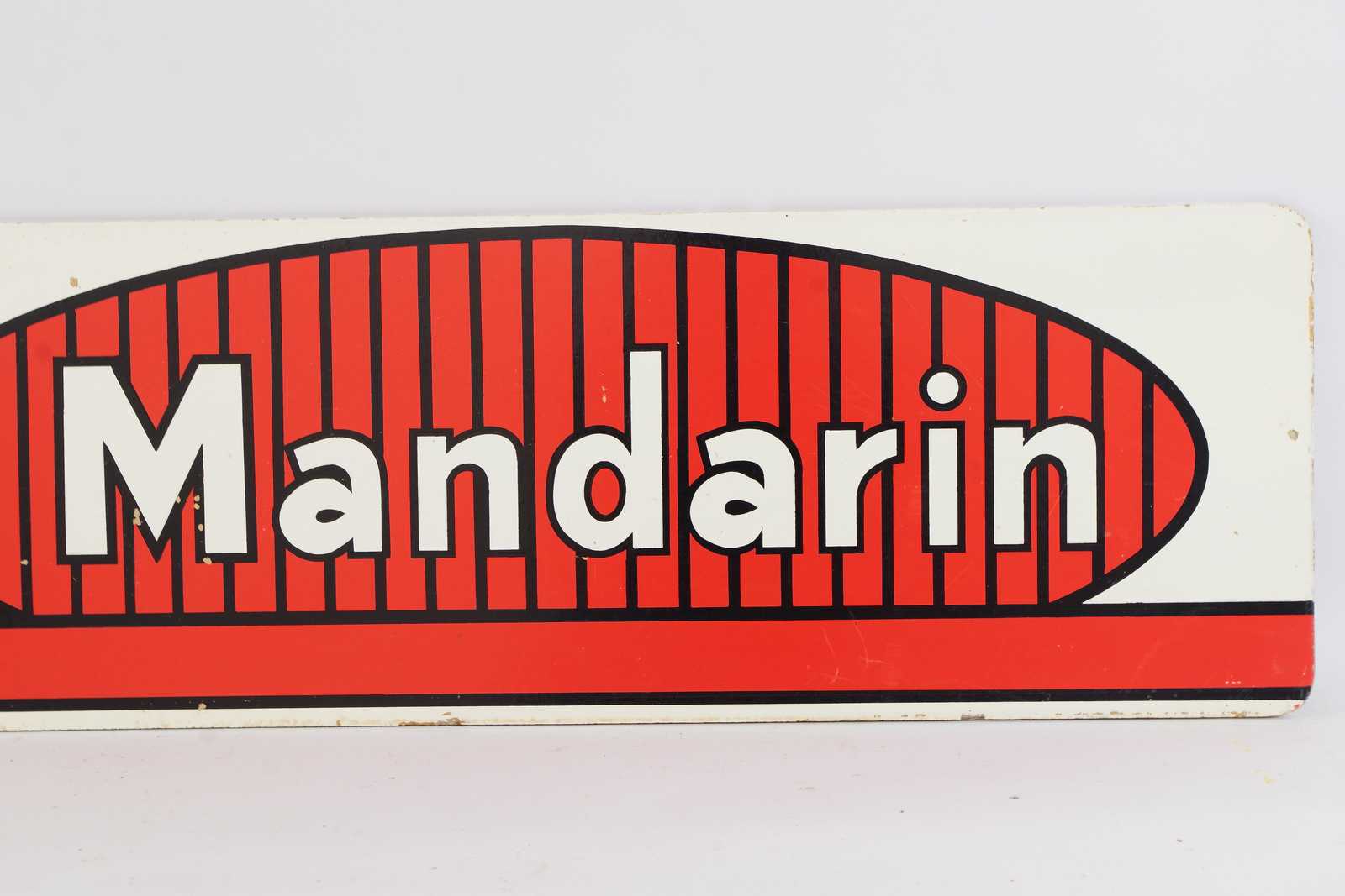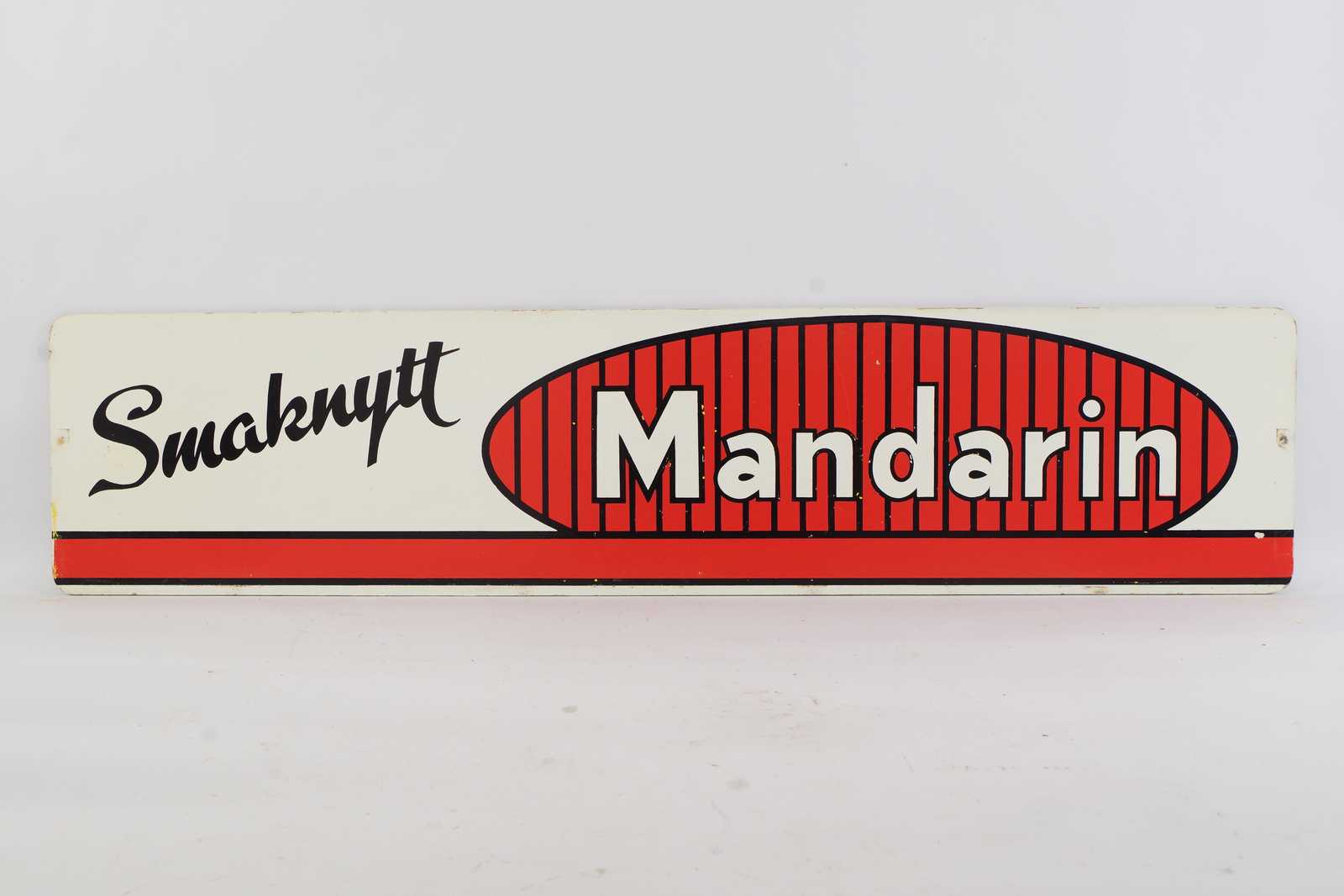 REKLAMSKYLT Mandarin Smaknytt, tvåsidig, tryckt på masonit, 1900 talets mitt. 110x25cm (slitage, färgbortfall förekommer)
