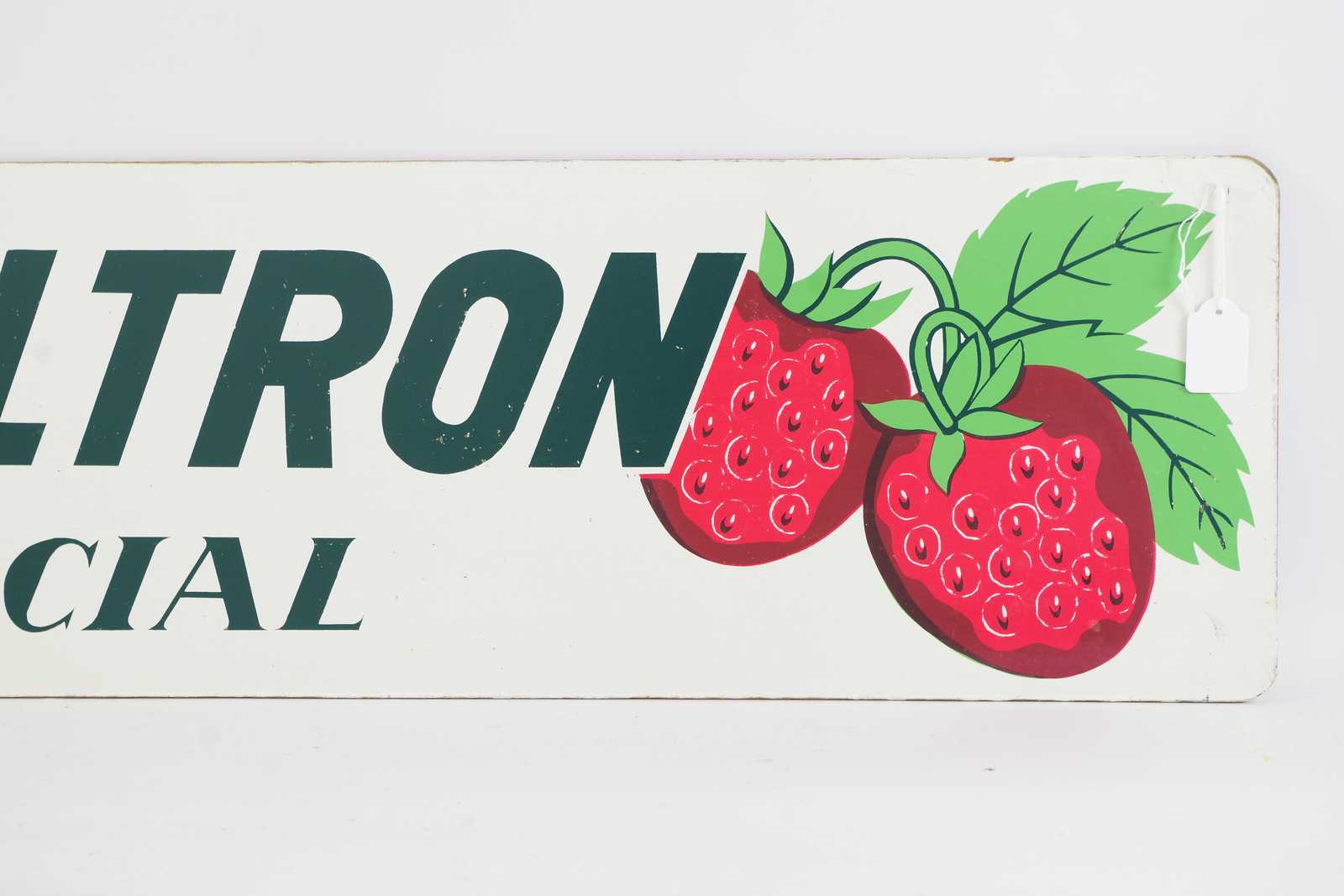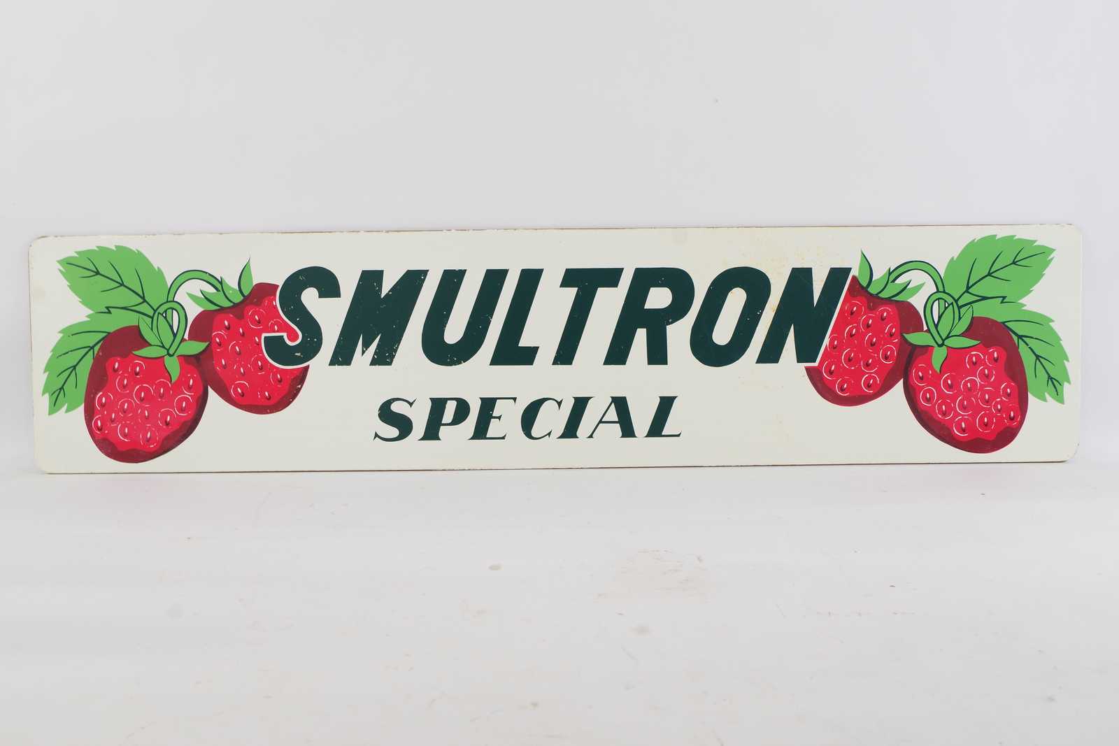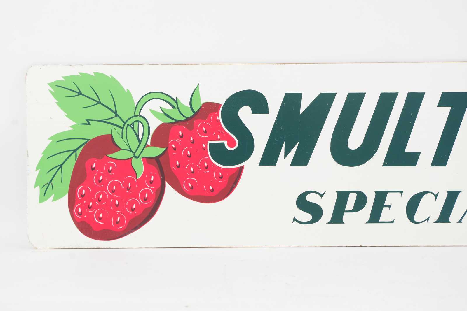REKLAMSKYLT Smultron Special, tvåsidig, tryckt på masonit, 1900 talets mitt. 110x25cm. (slitage, revor förekommer)