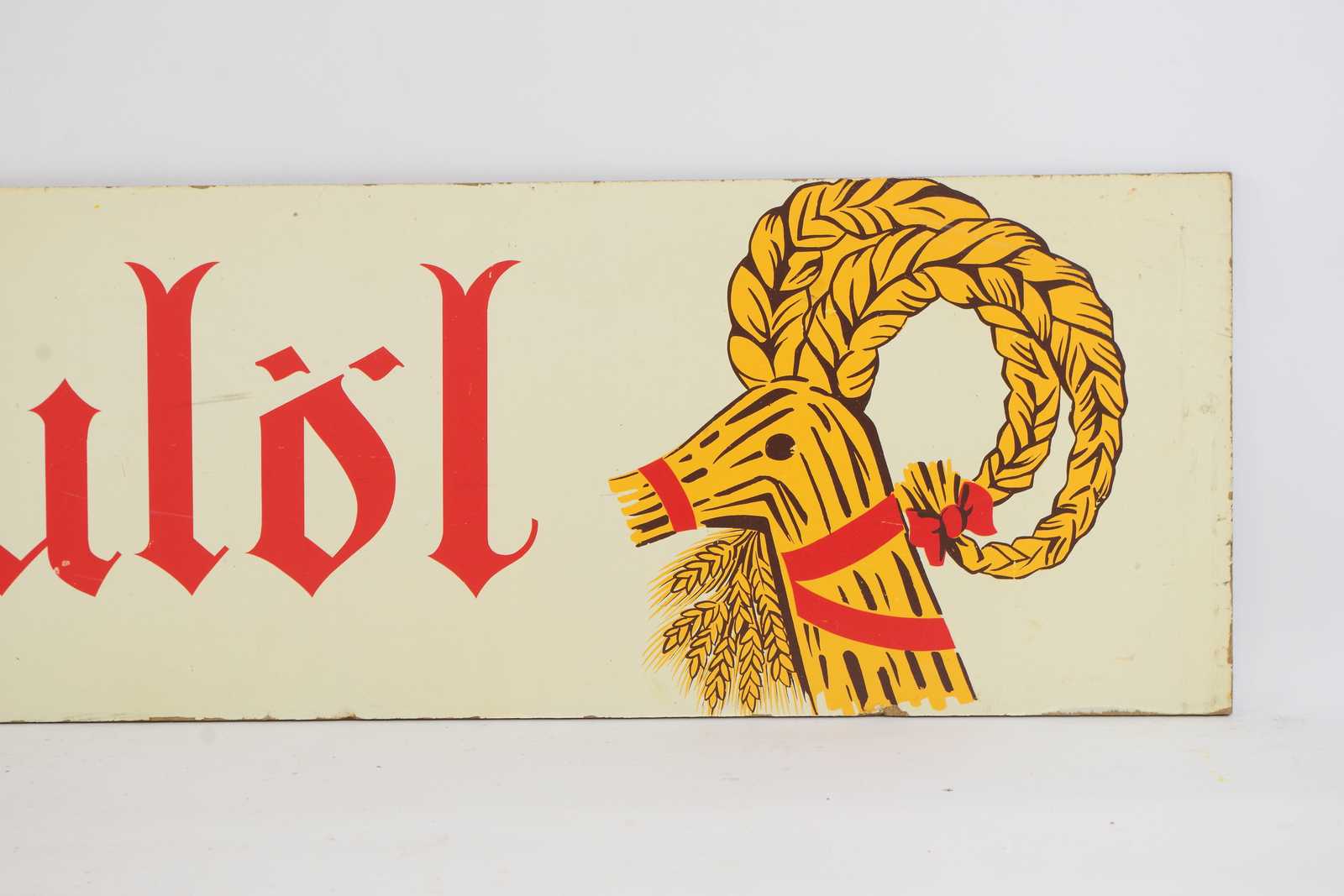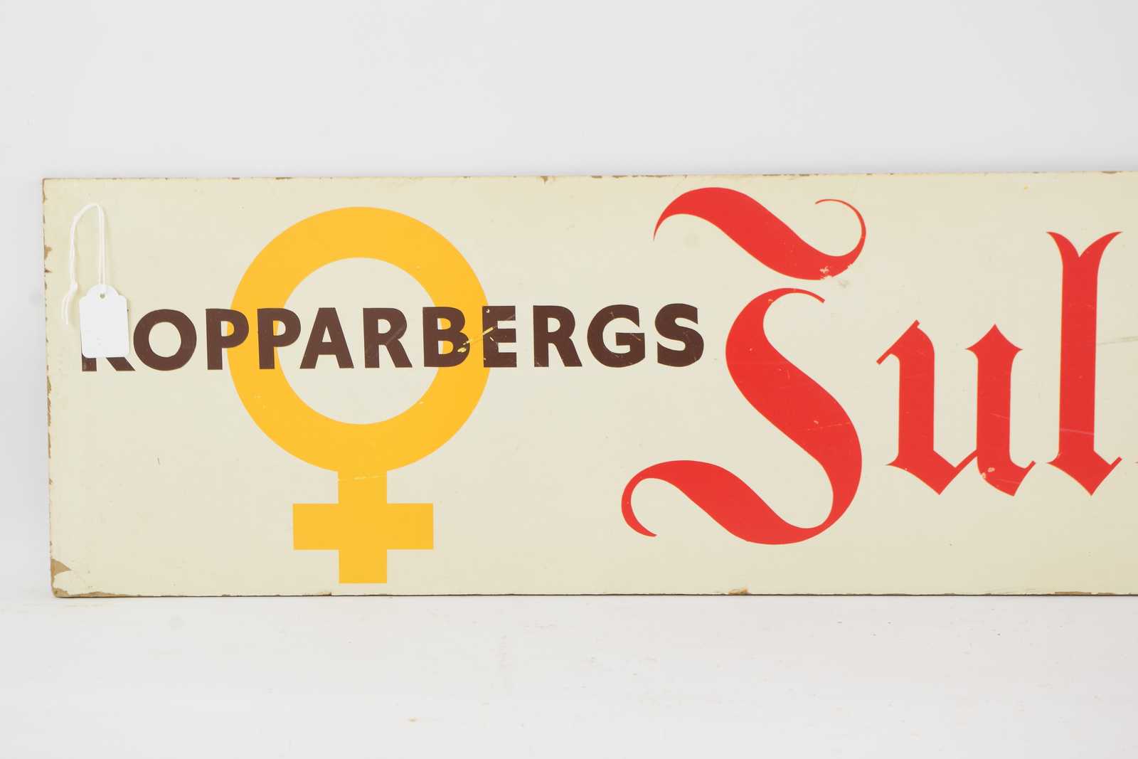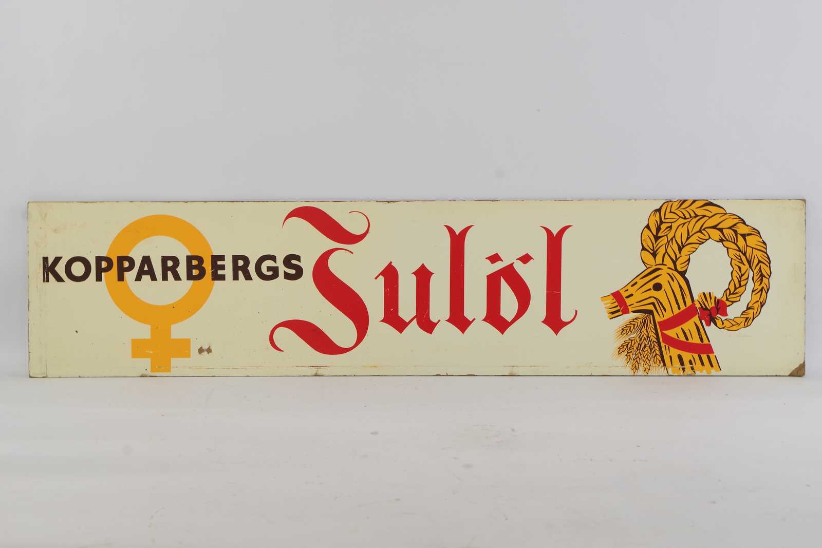 REKLAMSKYLT Kopparbergs Julöl, tvåsidig, tryckt på masonit, 1900 talets mitt. 110x25cmcm (slitage, färgbortfall förekommer)
