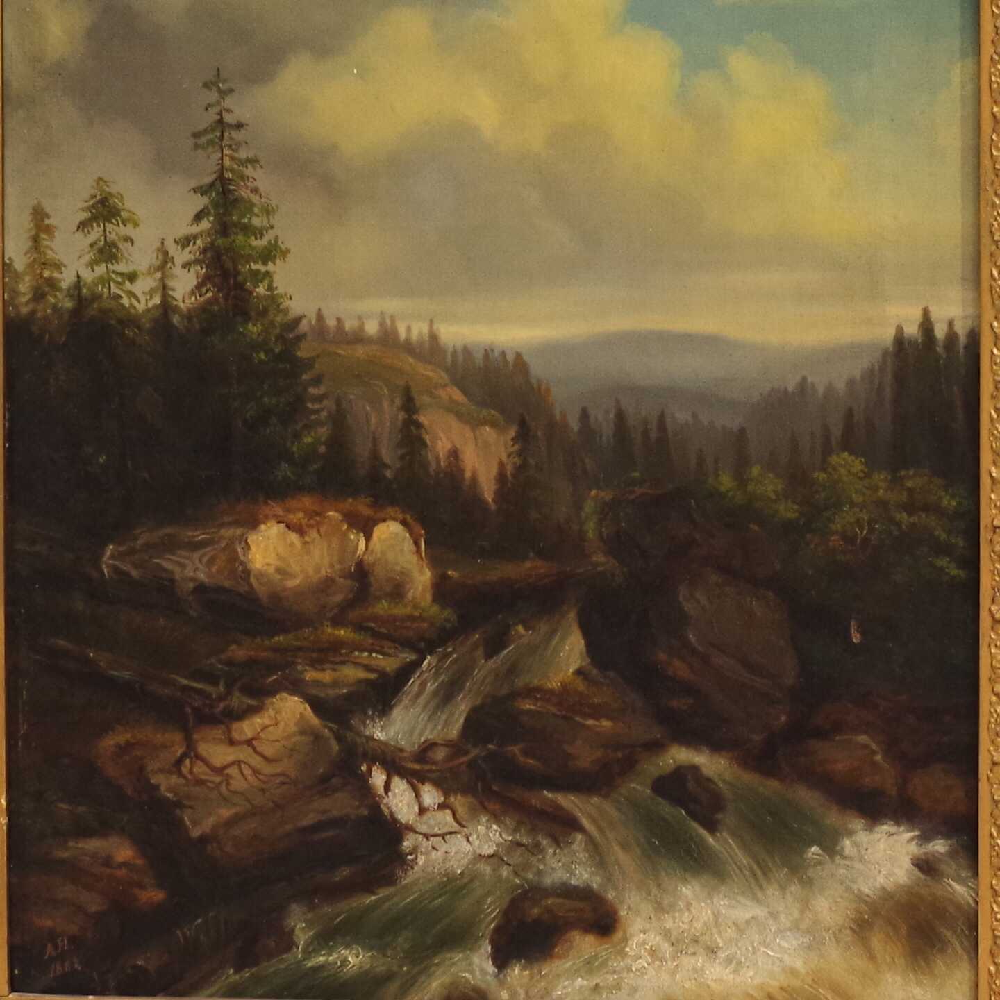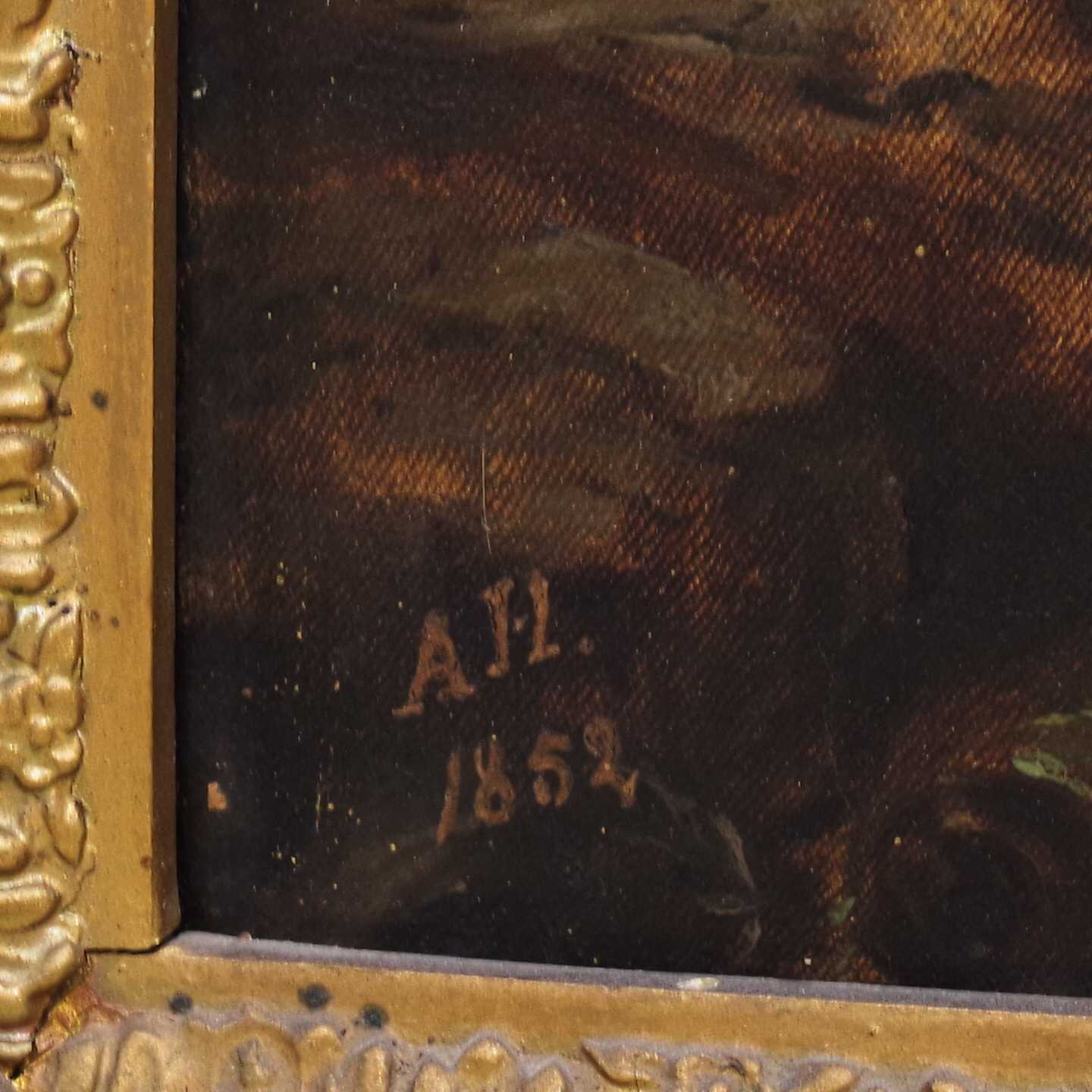 Bilder TAVLA, Anders Hallin, olja på duk, signerad samt daterad 1852. 40x51cm bildmått. slitage, hål.