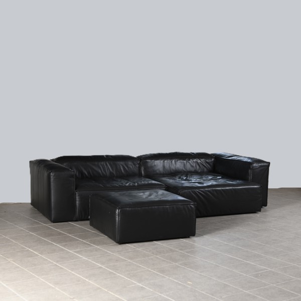 Svart läderklädsel, längd 320, djup 120-150, sitthöjd 38, puff 90x90 cm