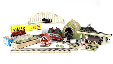 Lok 5st, byggnader räls, Märklin, Faller, Heljan mm, Skala H0