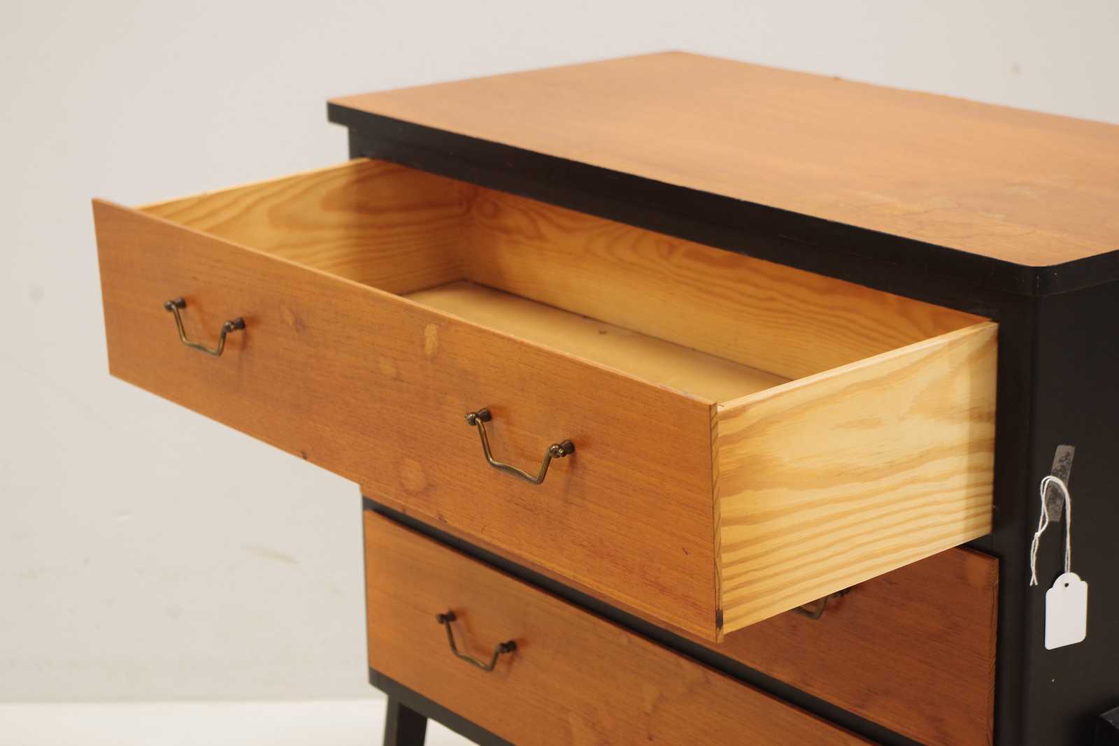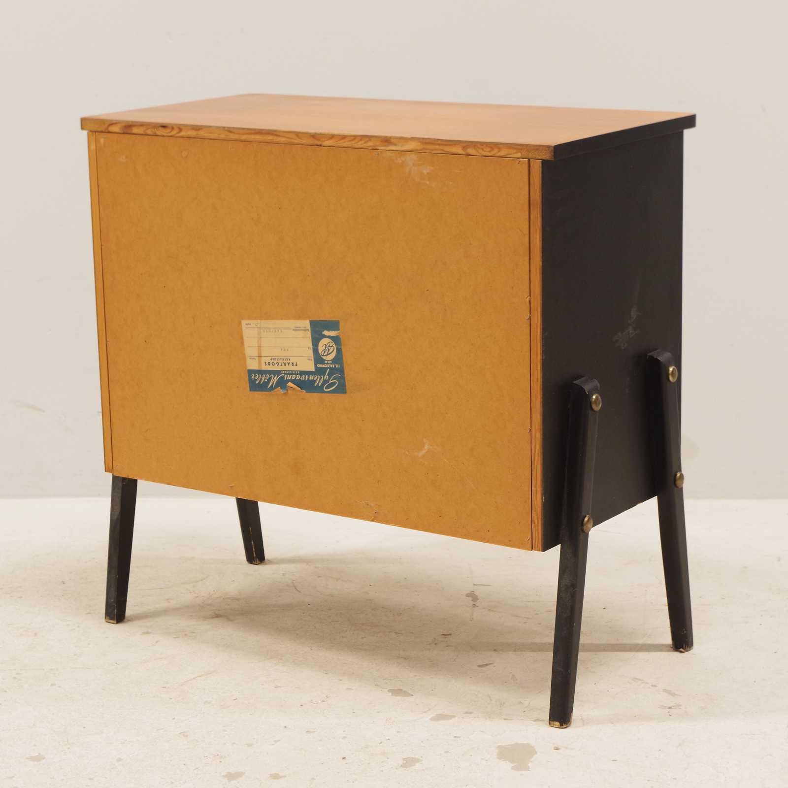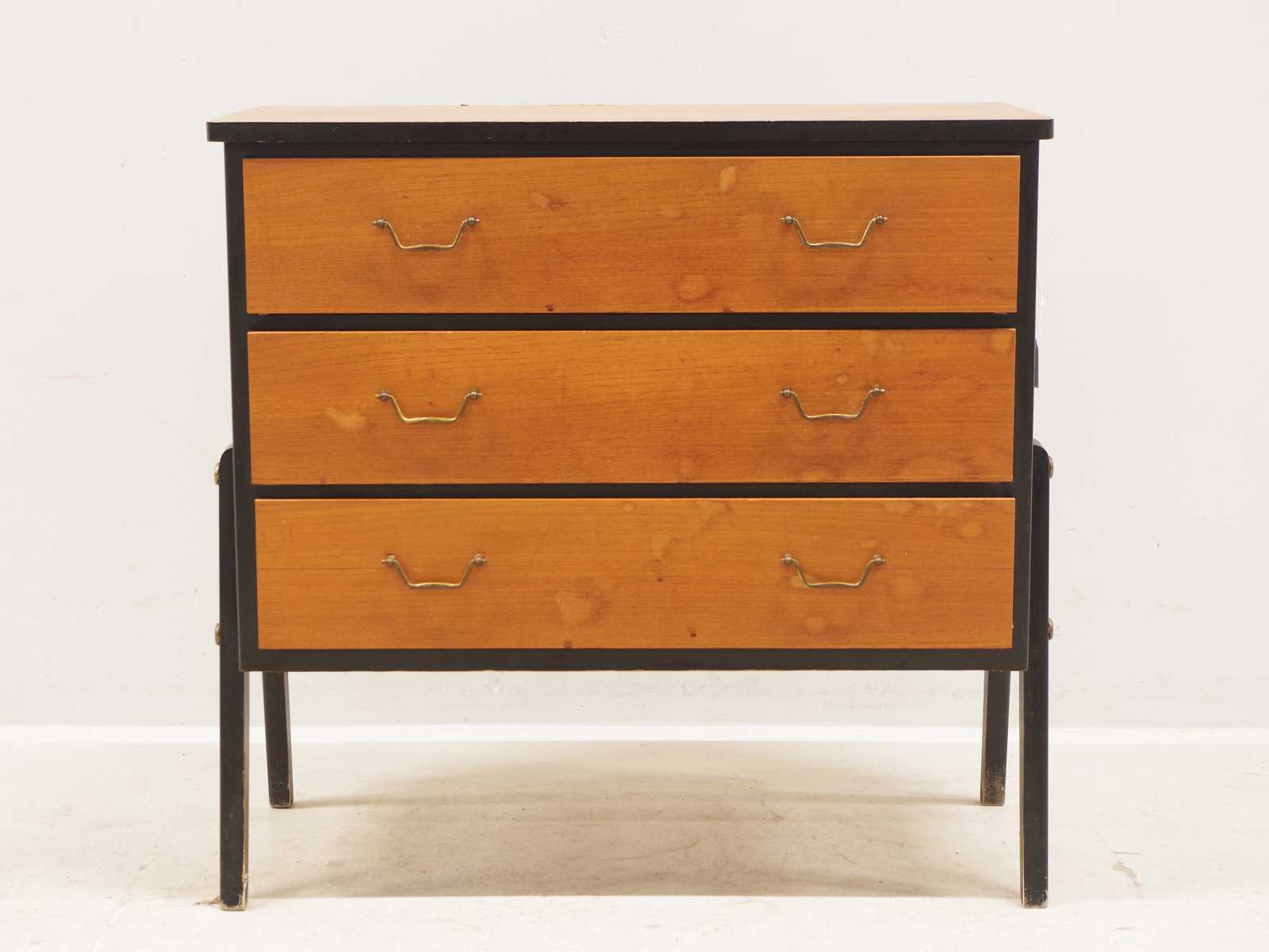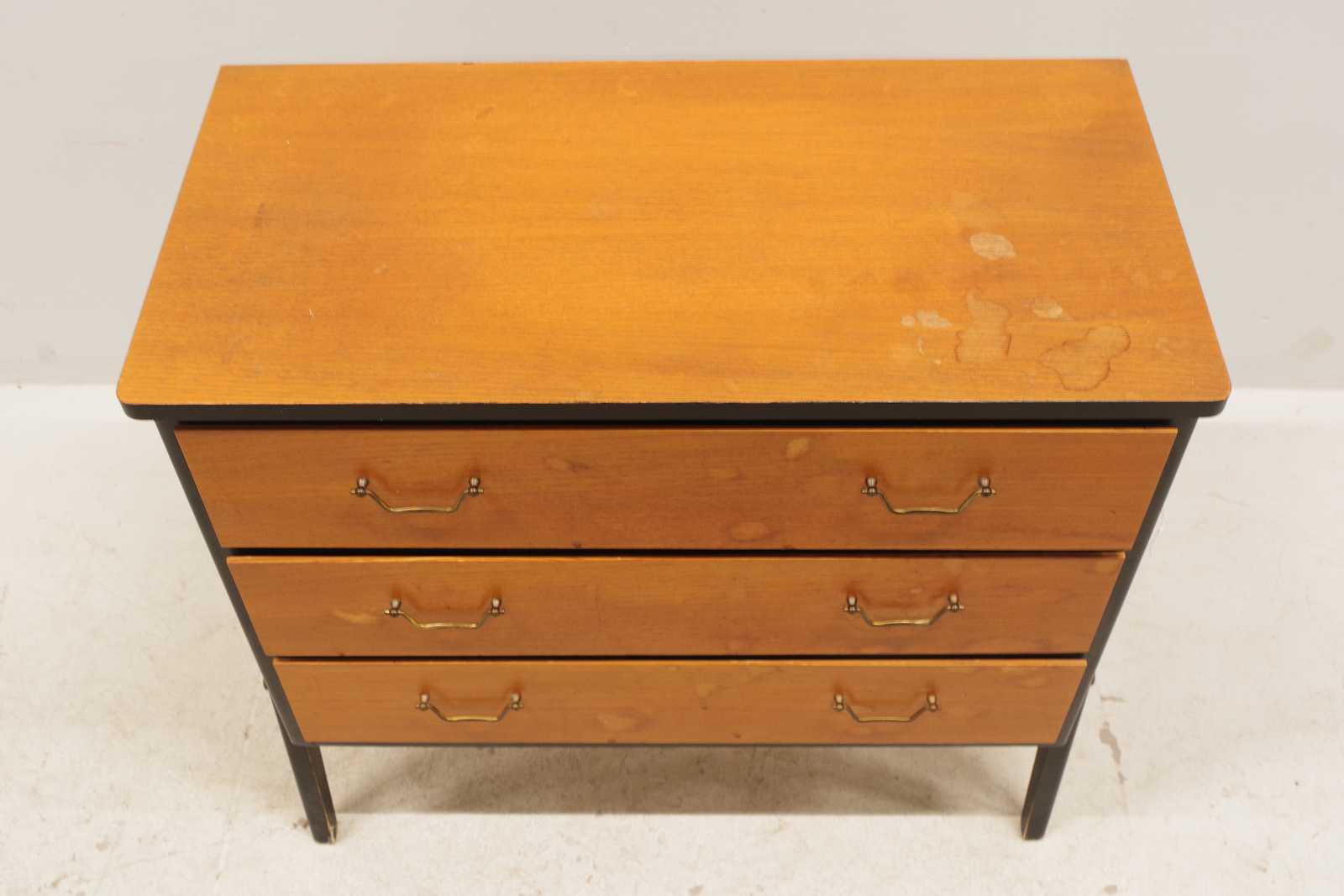 Auktioner BYRÅ 3 lådig, Gyllensvans Möbler, fanerad i teak, 1950-60 tal. H:69x 70x 35cm (bruksslitage, fläckar)