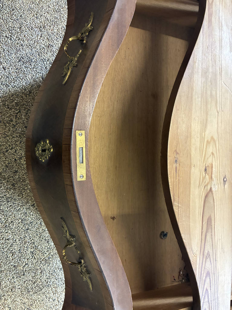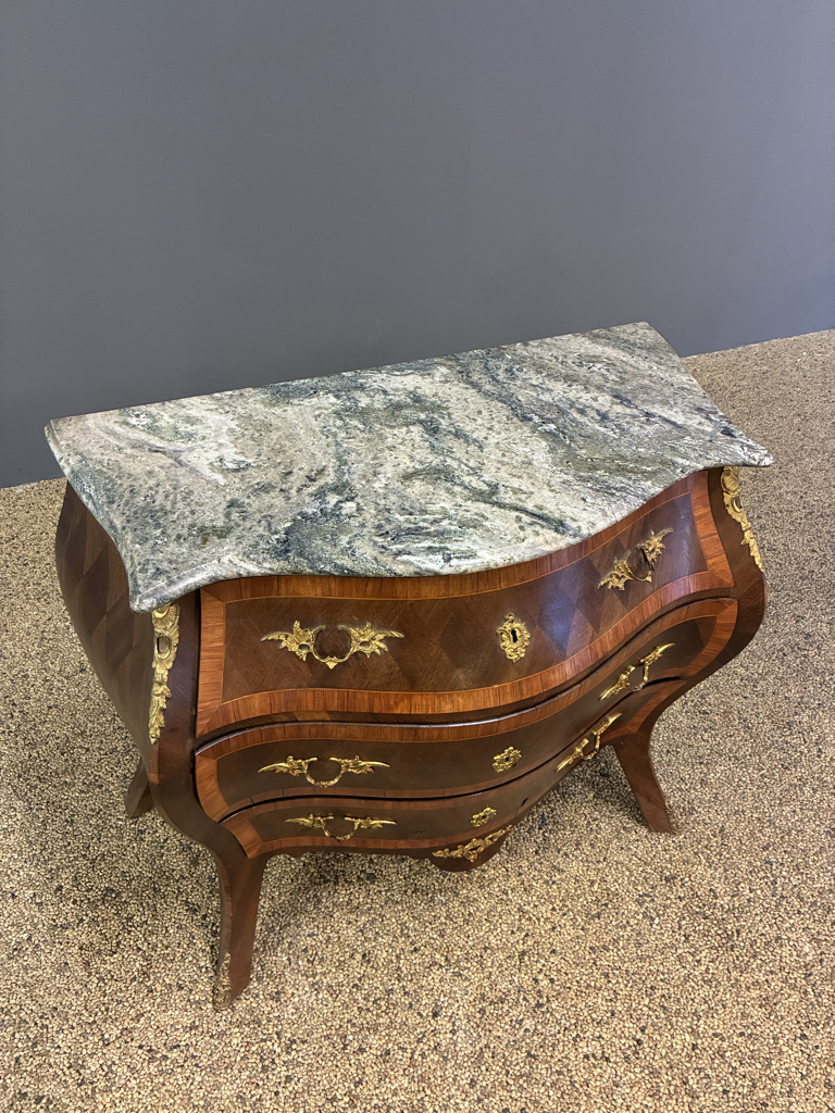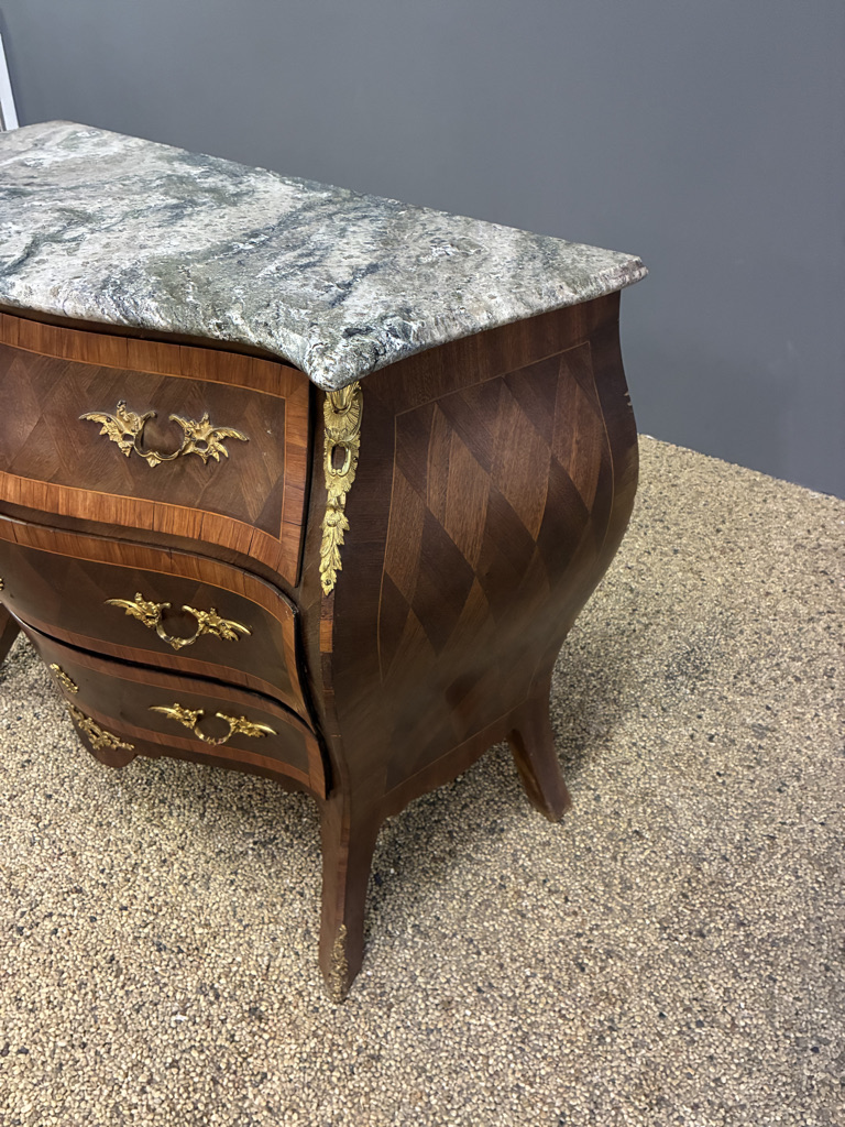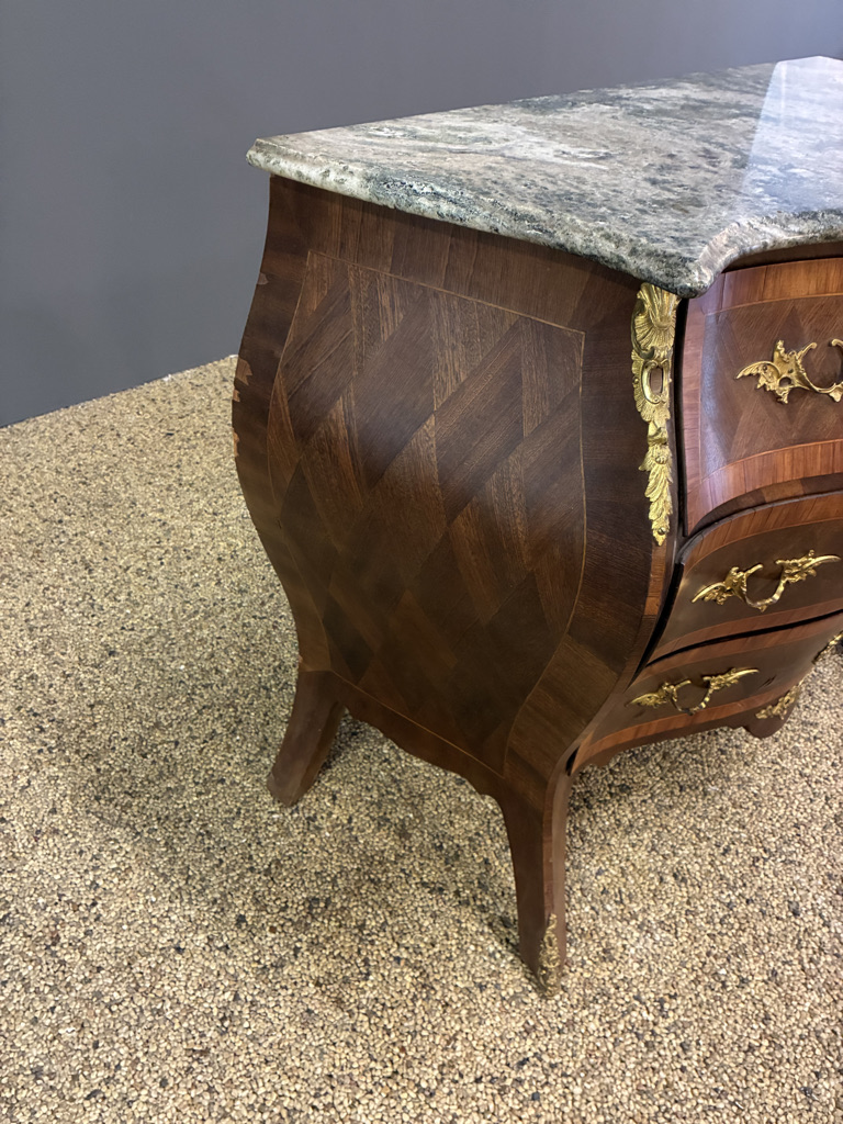 Klassisk modell med grå/grön-melerad stenskiva. Div fanérskador samt åldersslitage. Nyckel saknas Höjd: 81cm, Bredd:102cm Djup:51cm