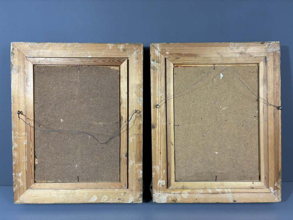 Två målningar på pannå. Okänd konstnär. Ramyttermått: 39cm x 48,5cm.
