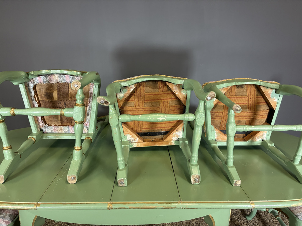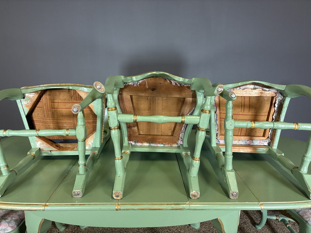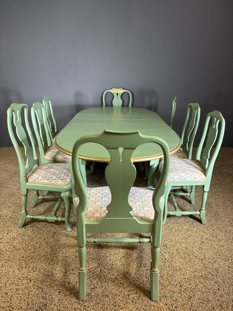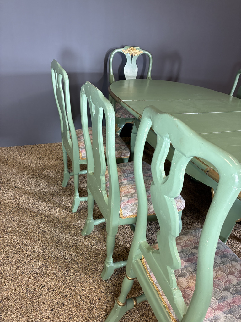 Grönmålat med guldmålade detaljer. 8st stolar varav två karmstolar. Stolarna är snarlika och 1700-tal samt senare kopior. Bordet har tre iläggsskivor om en storlek av 28,5cm vardera. Bord utan iläggsskivor är 144cm långt. Bredd:105cm. Div färgsläpp samt bruksslitage.