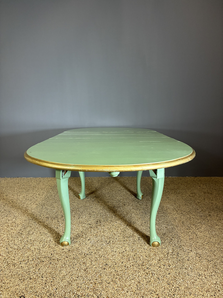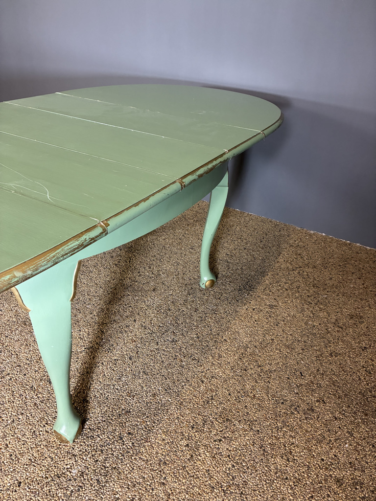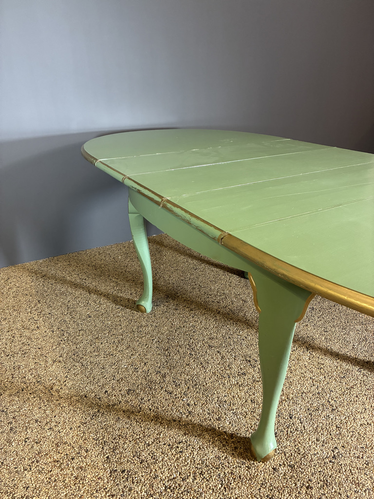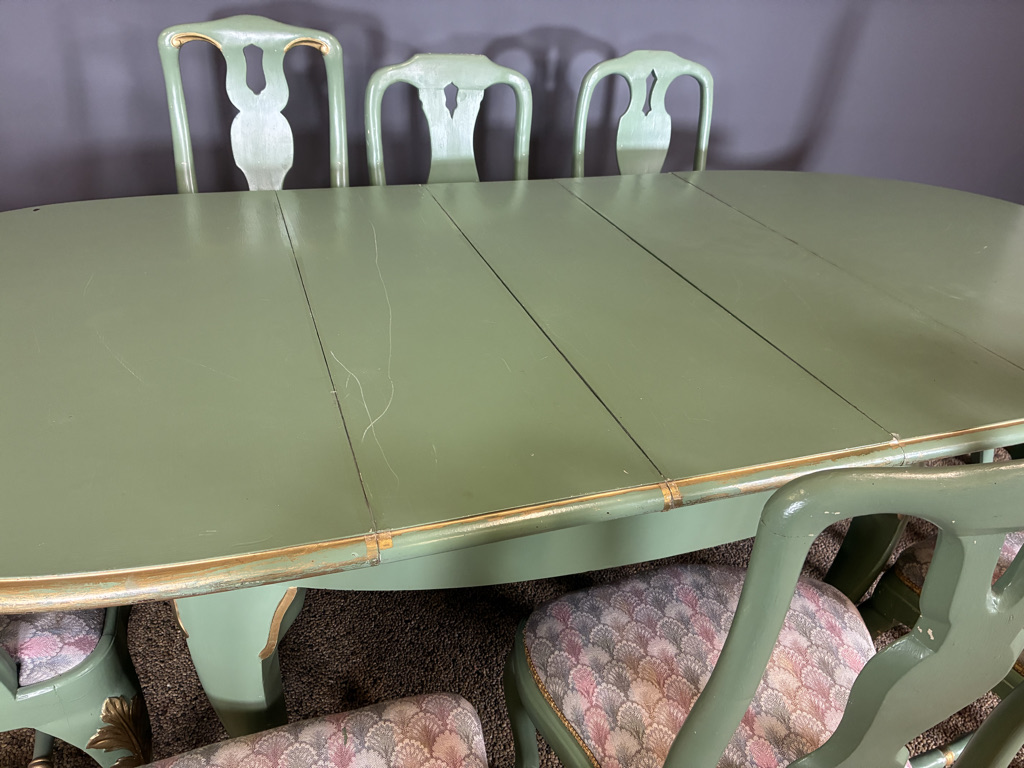 Grönmålat med guldmålade detaljer. 8st stolar varav två karmstolar. Stolarna är snarlika och 1700-tal samt senare kopior. Bordet har tre iläggsskivor om en storlek av 28,5cm vardera. Bord utan iläggsskivor är 144cm långt. Bredd:105cm. Div färgsläpp samt bruksslitage.
