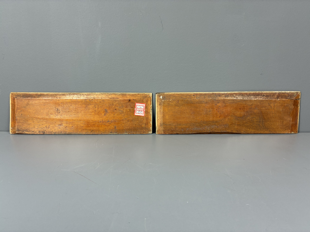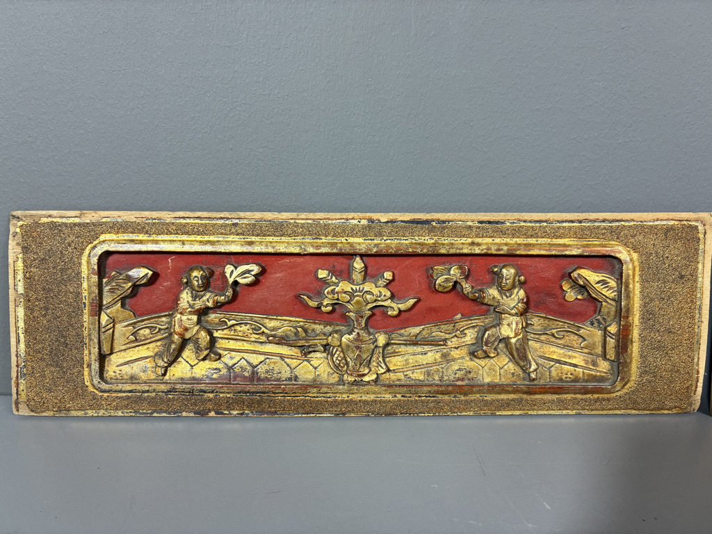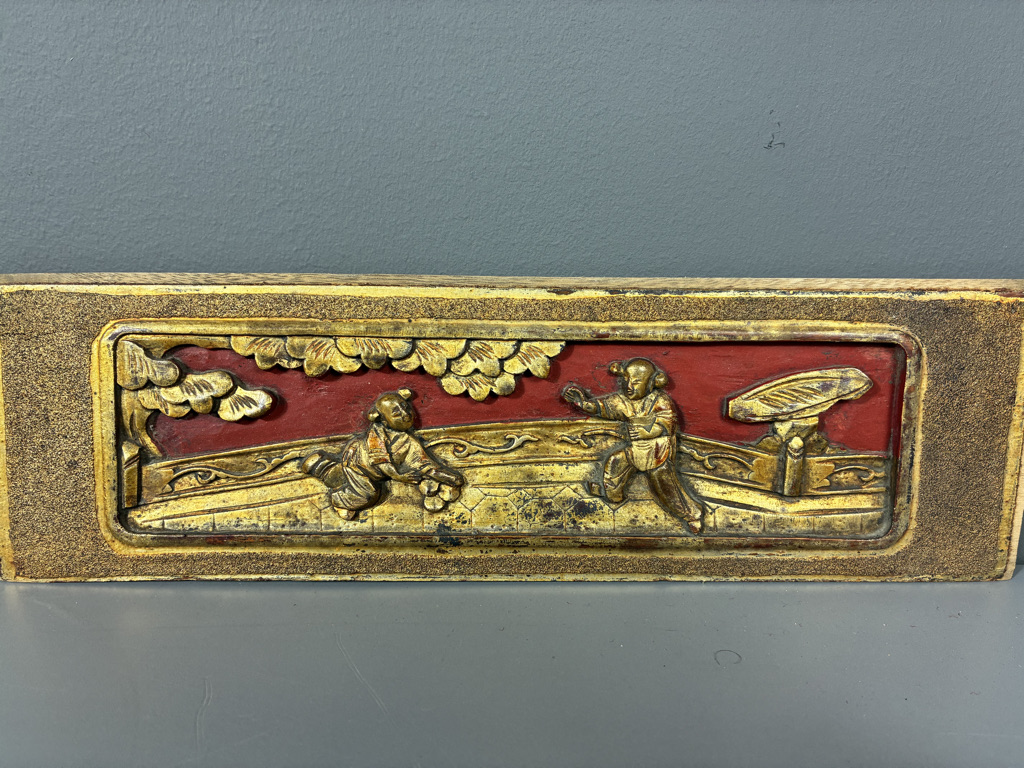 Paneler med snidade asiatiska motiv. Åldersslitage. 33cm x 10cm.