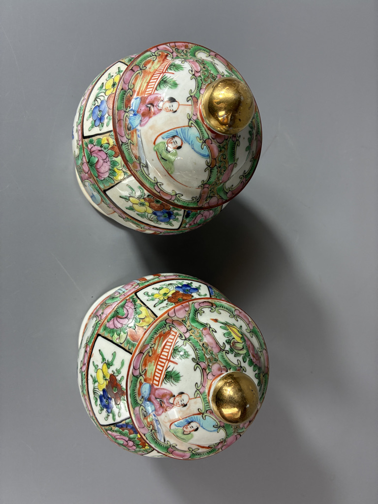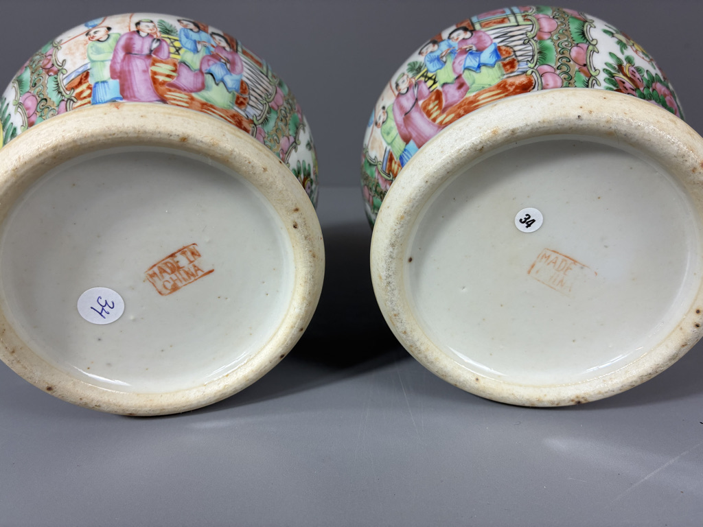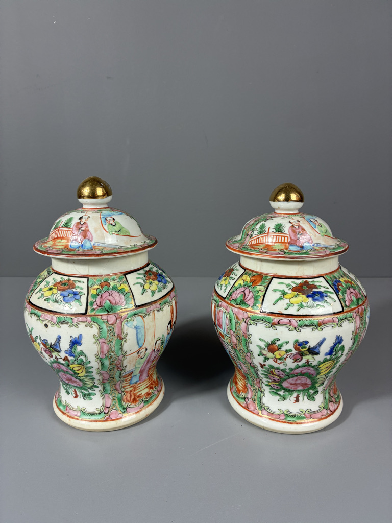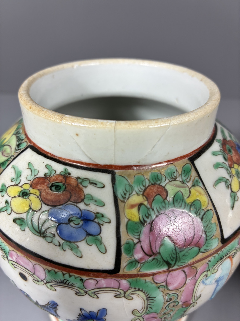 Urnor med lock och klassiska kinesiska motiv. Åldersslitage och lagning enl bild. Höjd:22cm